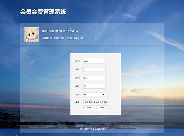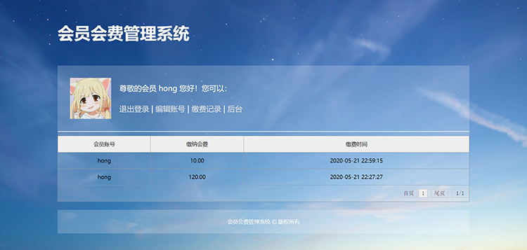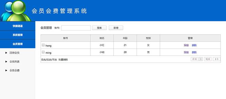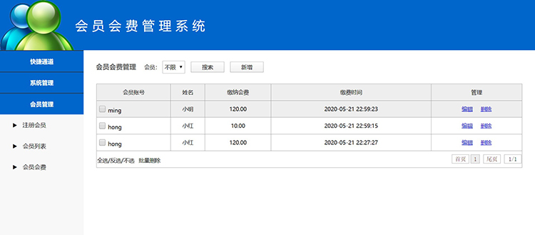 管理:管理員可增加多個,管理員可對會員及繳費記錄進行增刪改查。
