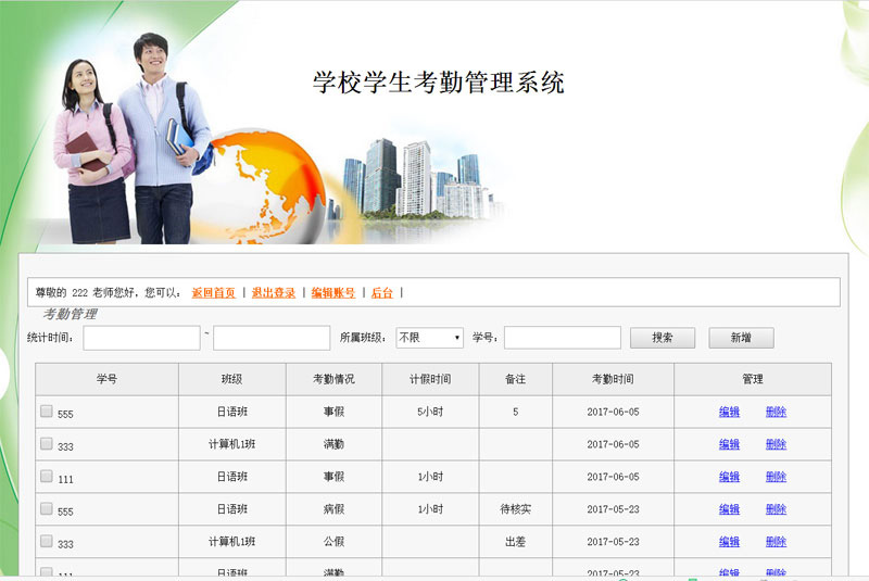 教師可管理多個班級,但一個班級只能由一個教師管理,教師和班級的綁定關系由管理員后臺設置;教師登錄后,可錄入所管理的班級的學生考勤情況,可多條件聯合檢索;