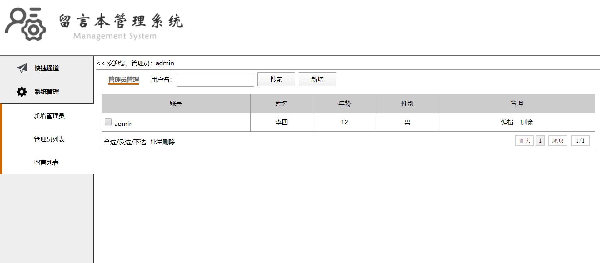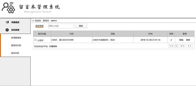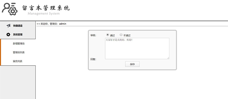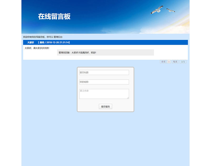 學生簡單在線留言板動態網站作業由php+mysql開發的小型訪客留言板程序,程序分為管理員和留言兩個功能模塊,2張數據庫表。