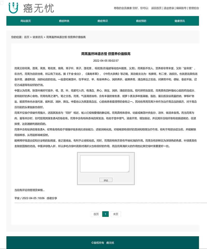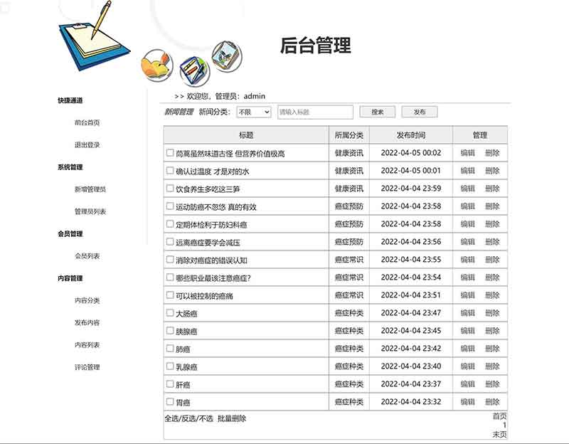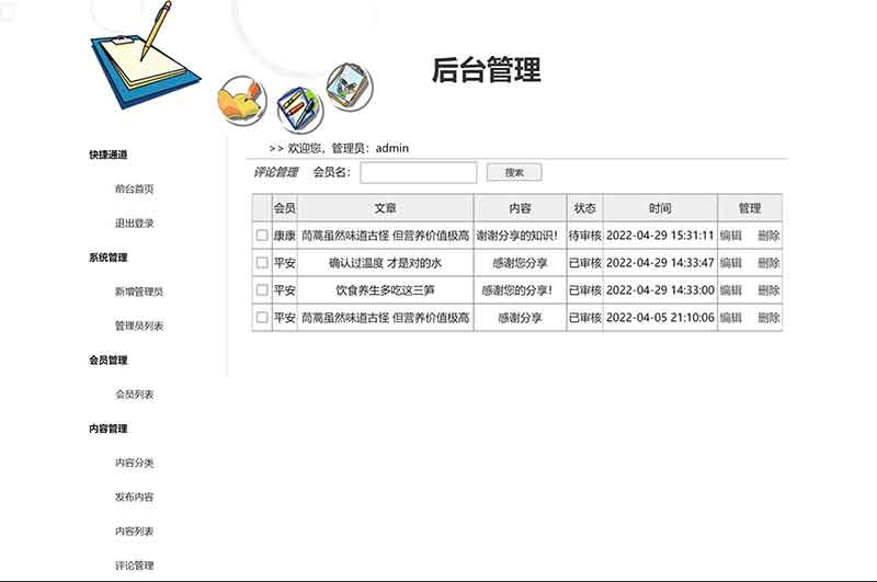 此作品為基于php mysql制作的新聞發(fā)布及會(huì)員評(píng)論文章管理系統(tǒng),系統(tǒng)設(shè)有管理員、會(huì)員、文章分類、文章、評(píng)論5大模塊。會(huì)員注冊(cè)登錄后可以發(fā)布評(píng)論,訪客只能瀏覽文章和已審核通過的評(píng)論,管理員具有最高權(quán)限,登錄后臺(tái)后可以對(duì)會(huì)員、文章、評(píng)論進(jìn)行增刪改查操作。設(shè)計(jì)了5張數(shù)據(jù)庫表,表設(shè)計(jì)合理,表之間有聯(lián)系。系統(tǒng)采用面向過程的方式開發(fā),無框架,代碼簡(jiǎn)單易懂。