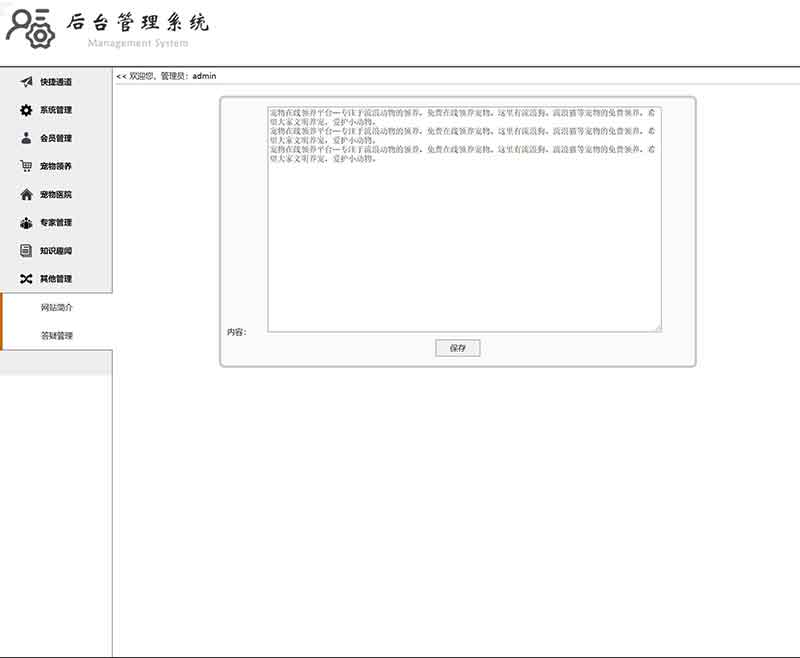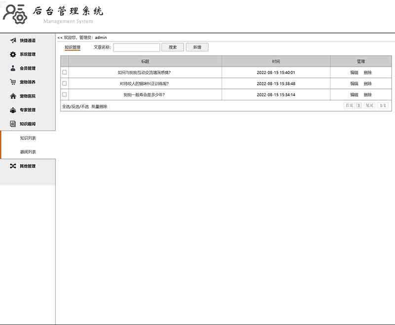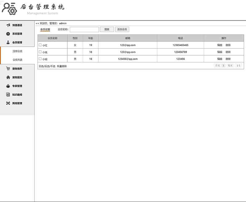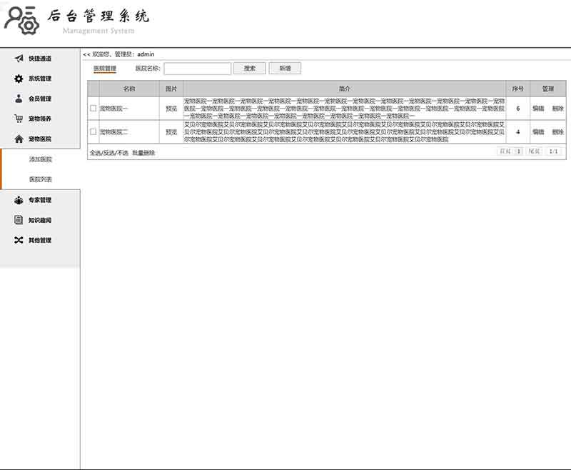 管理員:擁有會員、醫院、專家、資訊、簡介、訂單、寵物等所有功能的管理權。