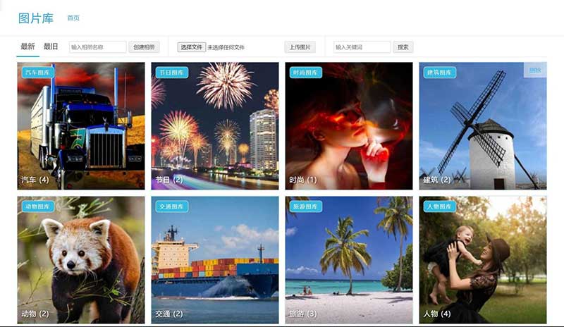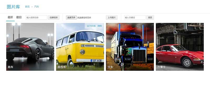 圖片列表:進入圖庫相冊后,可新增子圖庫相冊,可上傳刪除圖片,可設置某一張圖片為圖庫相冊封面。