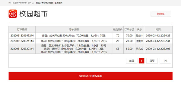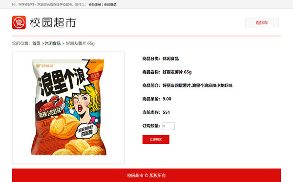 PHP校園超市商城網站-前端介紹:訪客可以瀏覽及搜索商品,訪客可以注冊成為會員,會員登錄后,可以修改密碼,可以退出登錄,可以購買圖書,有購物車和訂單模塊。購物車內商品可調整數量,訂單可以設置送貨地址。首頁及商品列表頁有分頁功能,目前設置的每頁顯示12個商品。