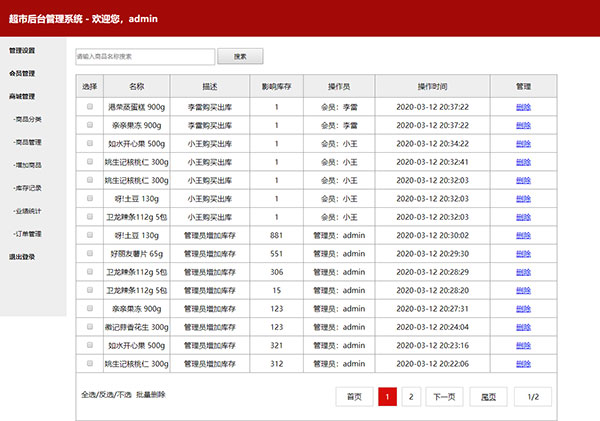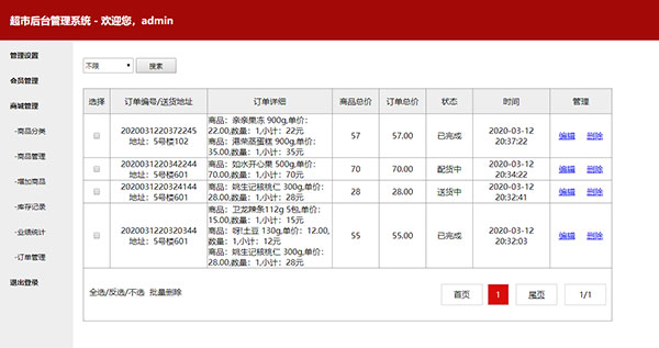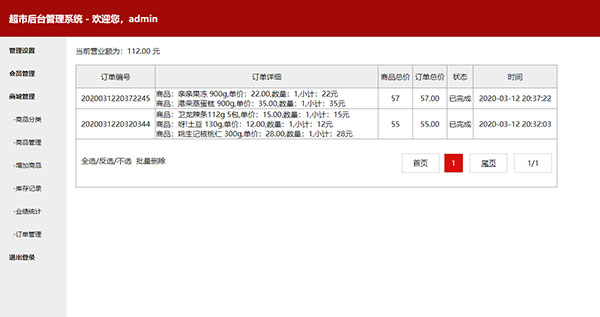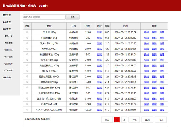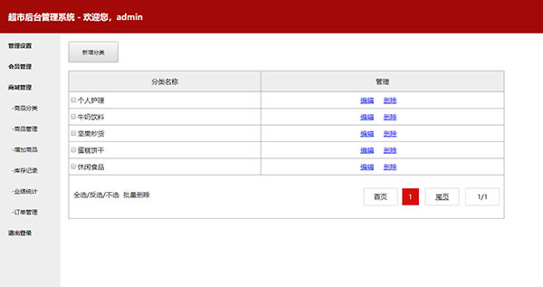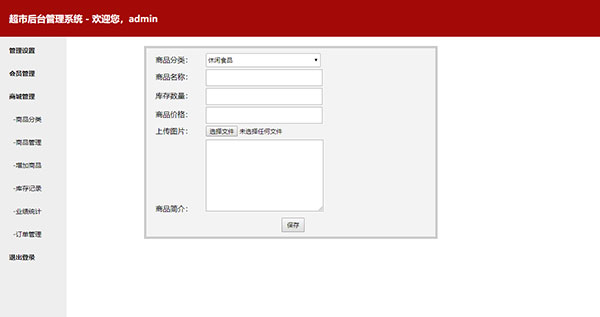 PHP校園超市商城網站-后臺介紹:后臺管理員可登錄,有增刪改查,登陸后可以管理員全部信息,例如會員、管理員、商品、分類的增刪改查等。后臺制作了業績統計、庫存記錄、訂單發貨操作等......