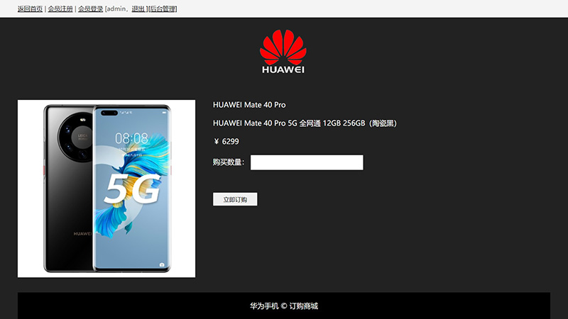 本學(xué)生PHP畢業(yè)設(shè)計網(wǎng)站作品采用PHP MYSQL制作,主題為華為手機預(yù)定商城,主要為展示新款手機的預(yù)定。具備會員注冊、會員登錄、商品預(yù)定、后臺添加、刪除、修改商品的功能。為簡單基礎(chǔ)版預(yù)定商城,主要實現(xiàn)商品信息瀏覽,不具備訂單等功能。