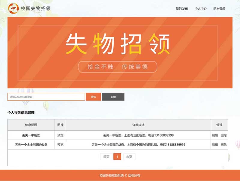 前端功能:搜索、注冊登錄、編輯個人信息、修改密碼、發(fā)布管理及刪除個人發(fā)布失物信息。