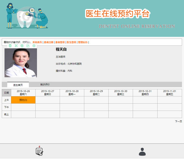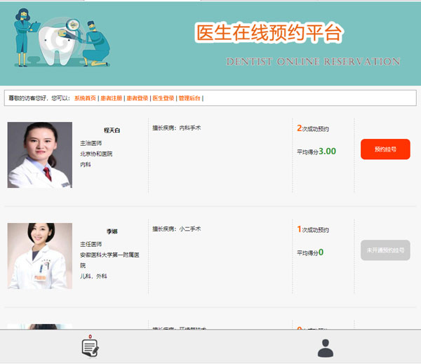 患者:可以查看或修改自己的個人信息,可以修改密碼;預約掛號;預約記錄;就診評價。