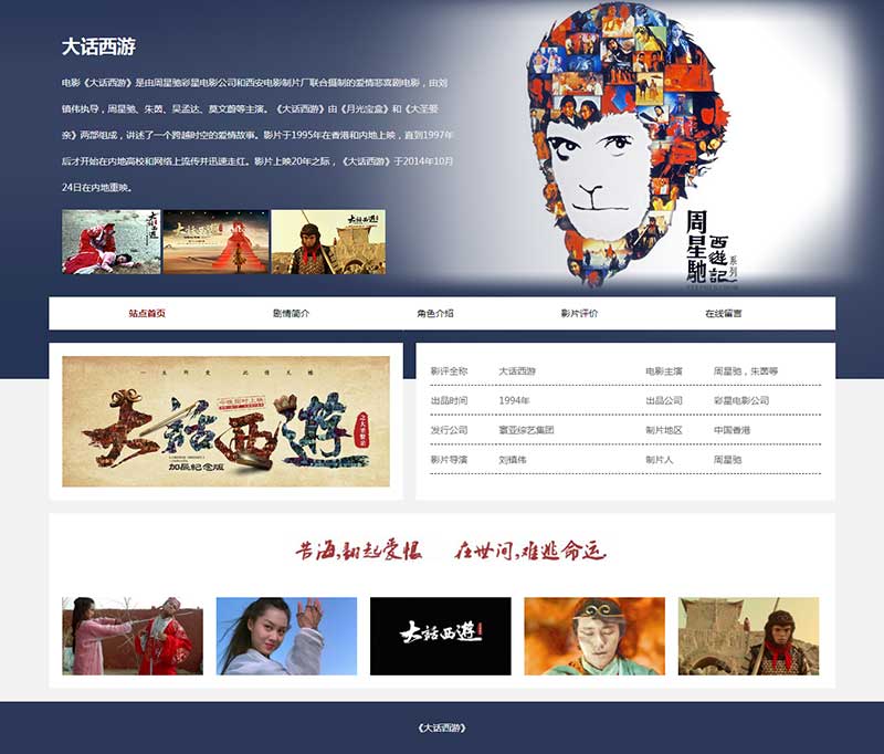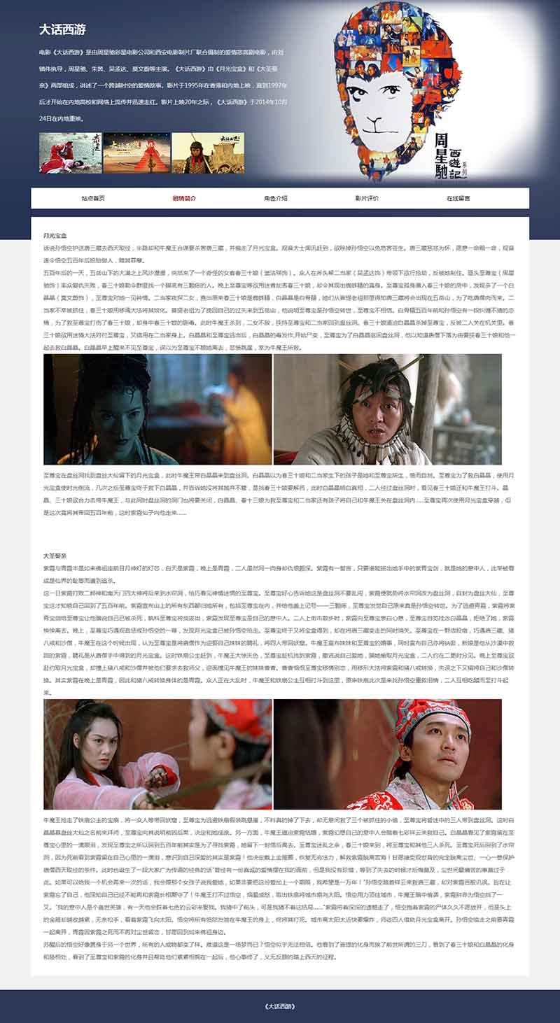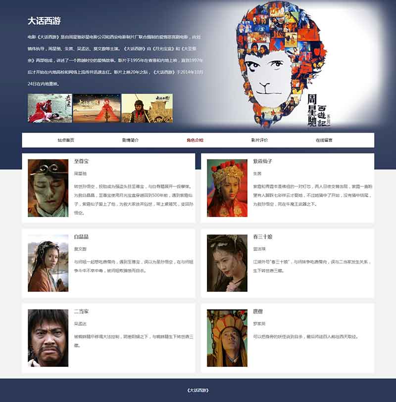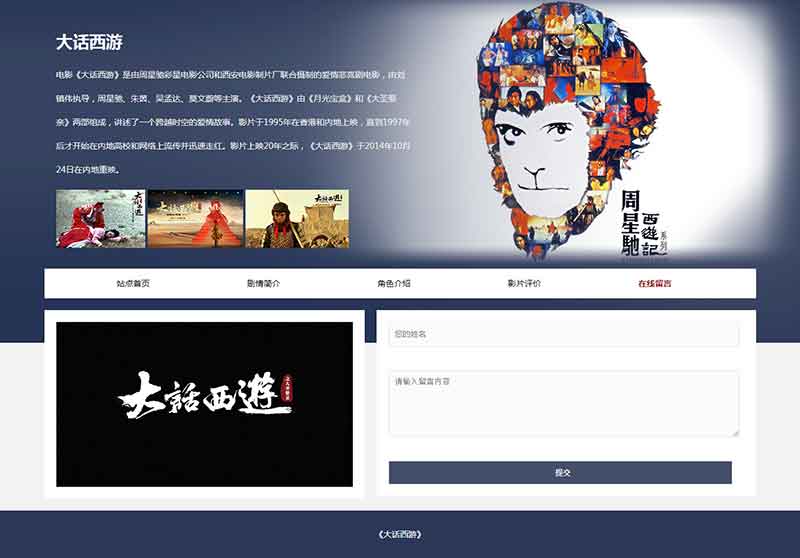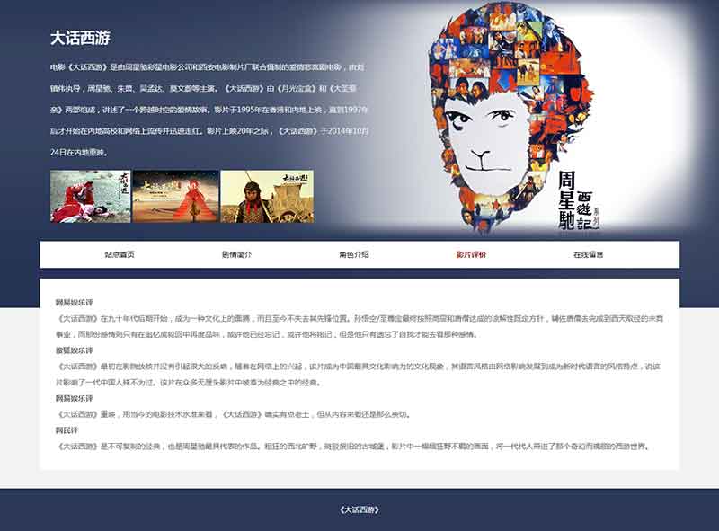 本作品由DIV+CSS布局制作,題材為大話西游電影,頁(yè)面包括站點(diǎn)首頁(yè)、劇情簡(jiǎn)介、角色介紹、影片評(píng)價(jià)、在線留言,共5個(gè)頁(yè)面,無復(fù)雜技術(shù)但頁(yè)面配圖及布局合理,首頁(yè)加入背景音樂 一生所愛 切合主題(進(jìn)入首頁(yè)后點(diǎn)擊任意區(qū)域會(huì)啟動(dòng)播放)。頂部區(qū)域 文字為代碼調(diào)用(加背景圖片)。四個(gè)子頁(yè)面排版布局均單獨(dú)制作。留言表單頁(yè)面單獨(dú)制作文本域和提交按鈕的CSS樣式,點(diǎn)擊提交JavaScript制作了彈窗提示。整個(gè)作品比較完善,細(xì)節(jié)處理到位。