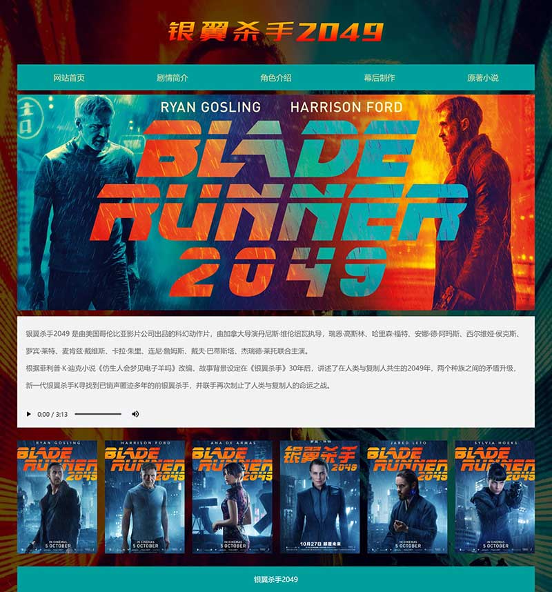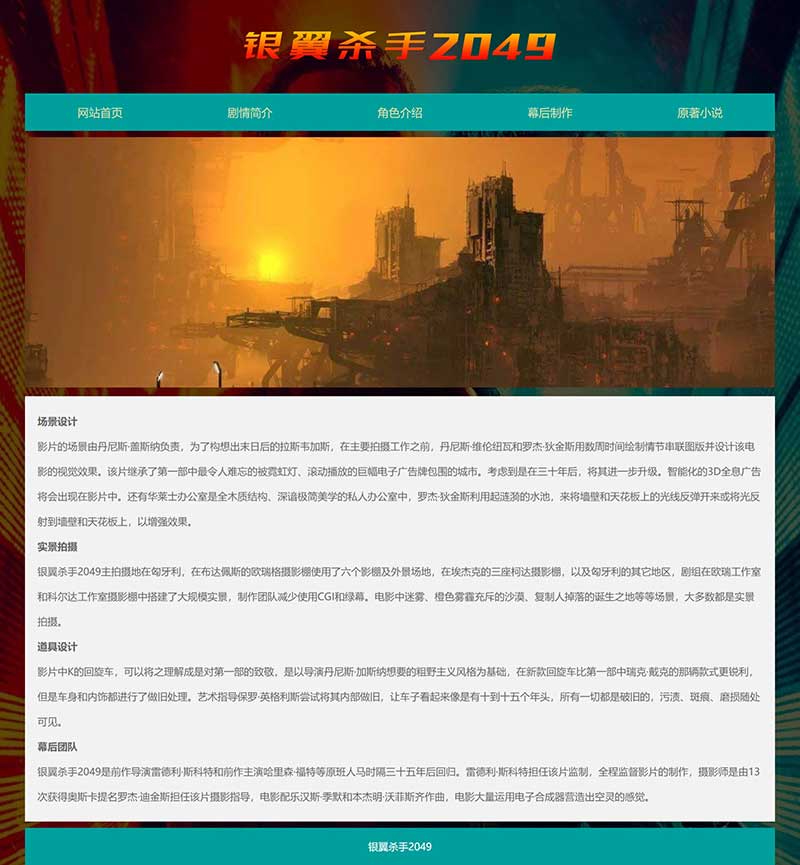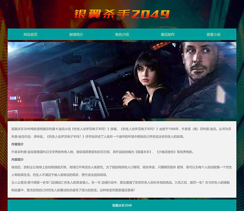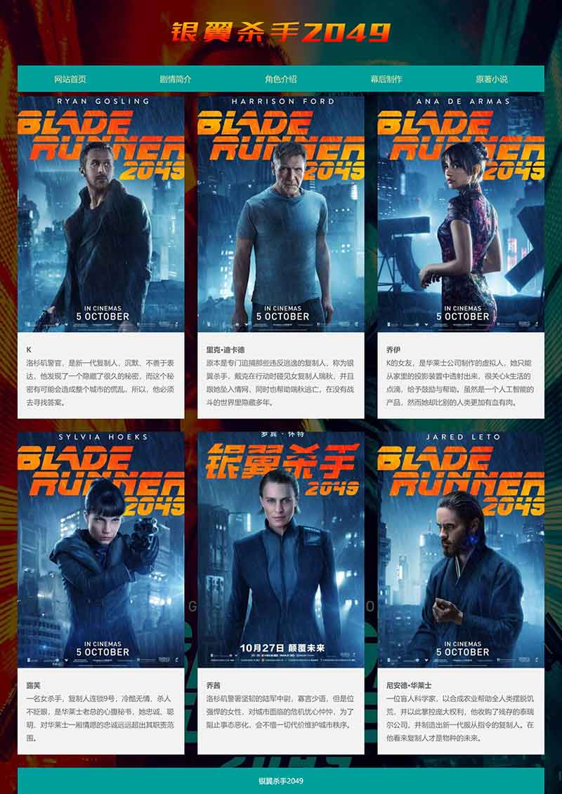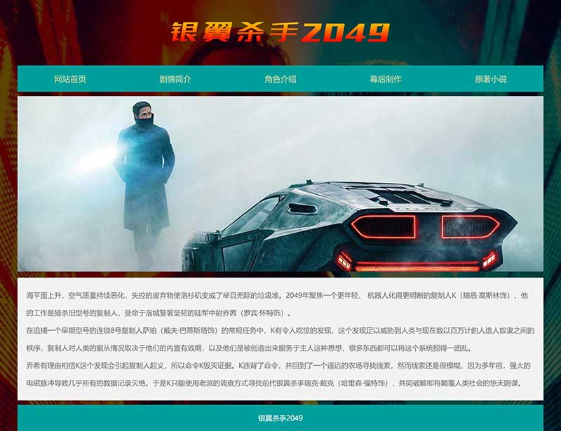 銀翼殺手2049電影靜態網頁作業設計了5個頁面,采用DIV CSS布局制作,網頁作品中的內容來源于百科,包括:網站首頁、劇情簡介、角色介紹、幕后制作、原著小說。