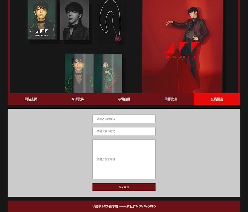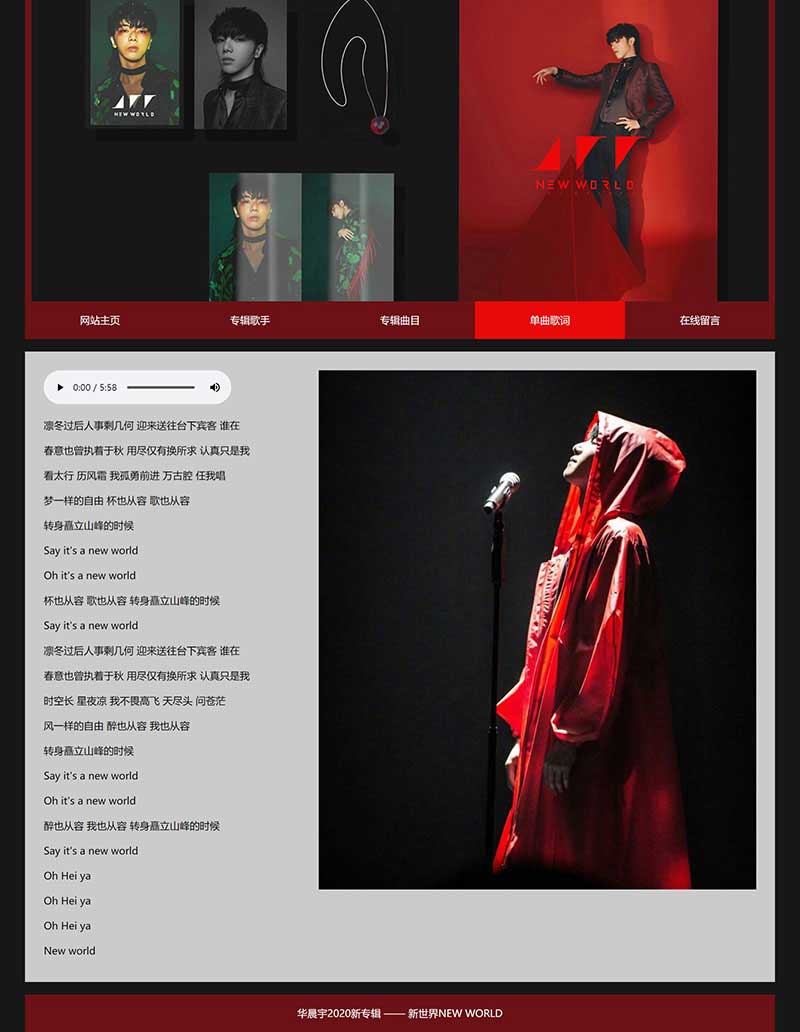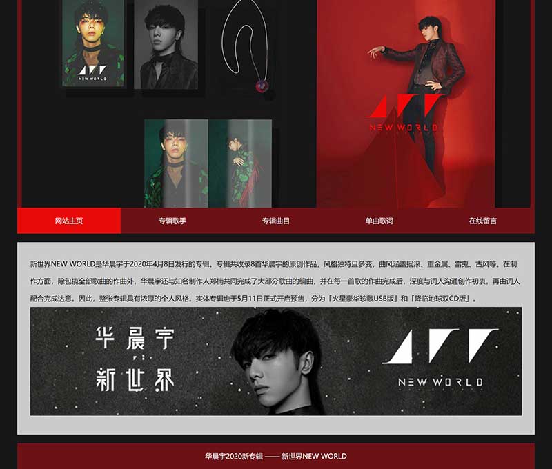 作品為音樂主題學生網頁設計作業(yè),題材為華晨宇2020年新世界專輯HTML網頁作品,網頁使用DIV CSS布局制作,有背景音樂頁面和表單頁面。代碼技術簡單頁面精美,共5個頁面:網站主頁(圖文首頁)、專輯歌手(文字頁面)、專輯曲目(圖文頁面)、單曲歌詞(背景音樂)、在線留言(表單頁面)。