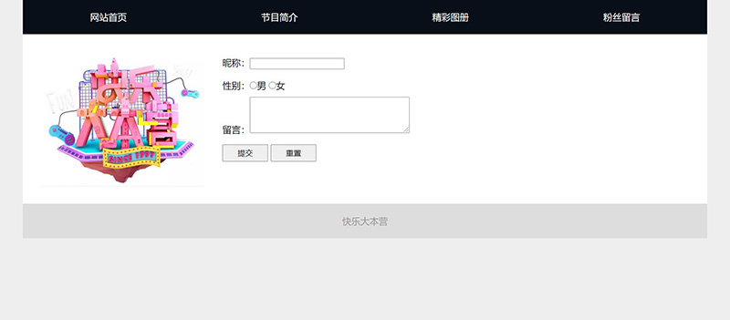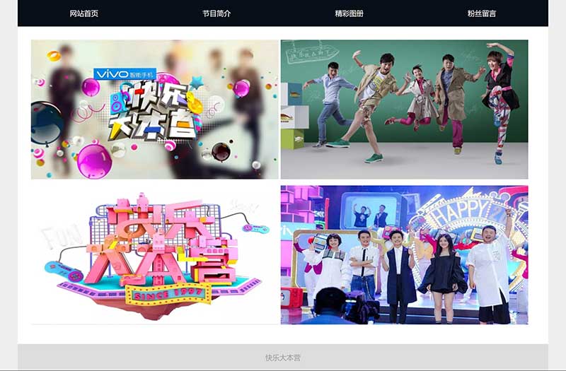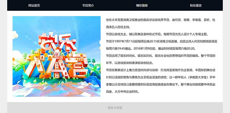 此學生網頁設計作業以綜藝節目-快樂大本營為題材制作4個頁面,網頁內容包括:首頁、節目介紹、精美圖冊、粉絲留言。使用dreamweaver采用TABLE表格布局制作完成,作品主體寬度為1200PX,網頁設計了背景顏色,有導航區、大圖區、內容區、腳部區。學生網頁設計基礎水平。