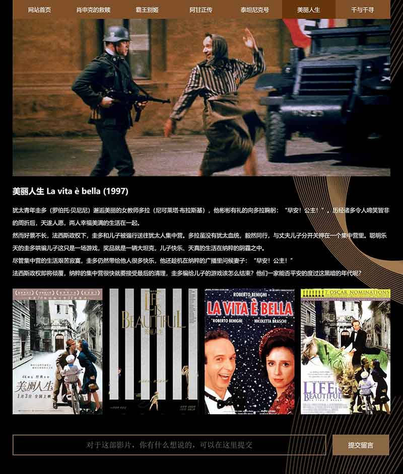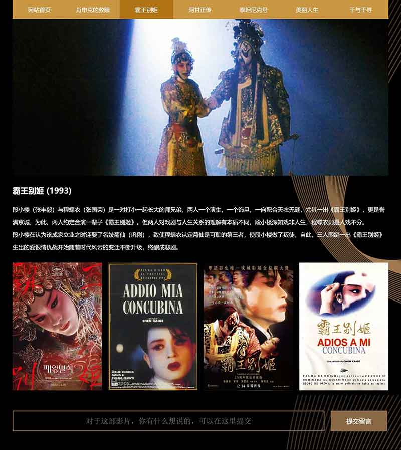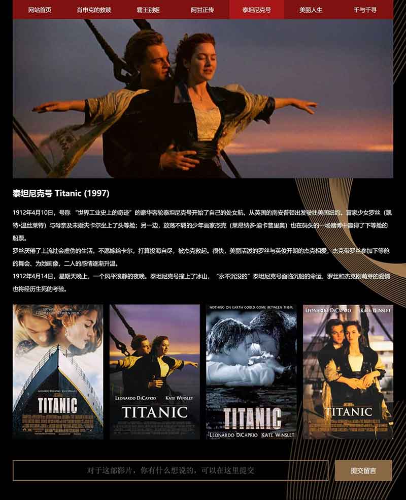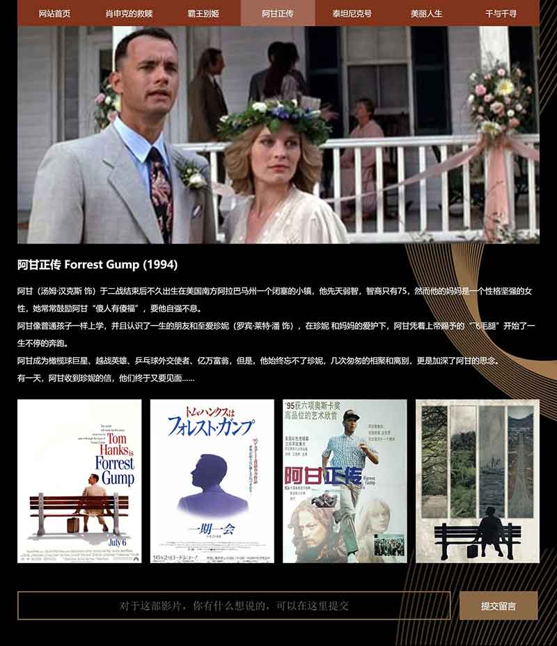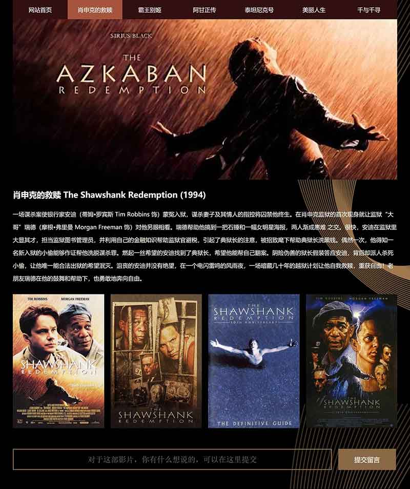 大學(xué)生電影網(wǎng)站設(shè)計與制作html網(wǎng)頁成品采用DIV CSS布局制作,主題為我的喜歡的電影榜單,作品包括1個首頁和6個電影介紹子頁面,共7個頁面。整體設(shè)置了網(wǎng)頁背景圖片,首頁頂部使用CSS3制作了LOGO鼠標(biāo)經(jīng)過放大效果,下方為6部電影封面圖,點(diǎn)擊可以進(jìn)入電影介紹的子頁面。每個電影子頁面都根據(jù)電影海報大圖的色調(diào)制作了不同顏色的導(dǎo)航欄目,通過導(dǎo)航可以返回首頁或者進(jìn)入其他子頁面。每個電影子頁面都包括導(dǎo)航、海報大圖、電影介紹、以及四張電影海報圖。電影介紹子頁面底部還簡單制作了電影評價表單。