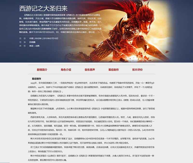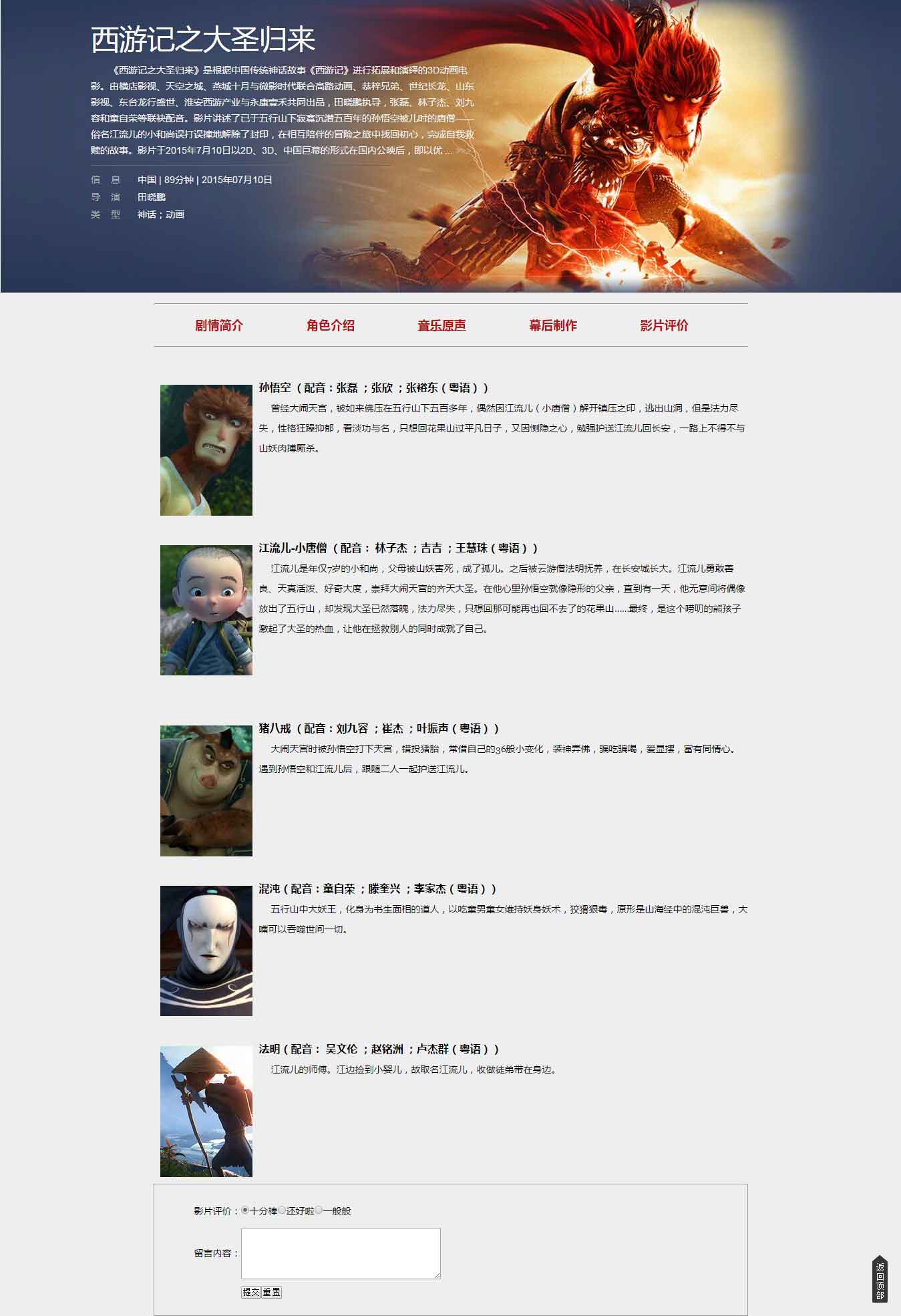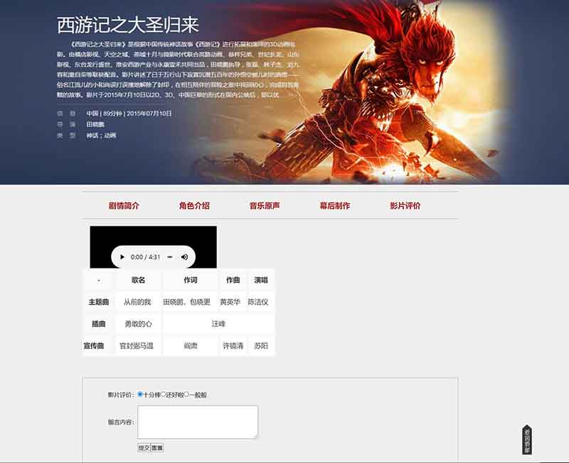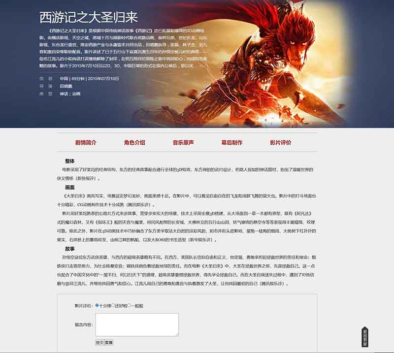 西游記之大圣歸來網頁設計DW影視電影類網頁作品下共計5個頁面,采用表格布局蜘蛛,功能有JavaScript彈窗提示,返回頂部按鈕,在線音樂播放,留言表單功能等,代碼簡單,頁面精美,大學生table布局基礎網頁水平。