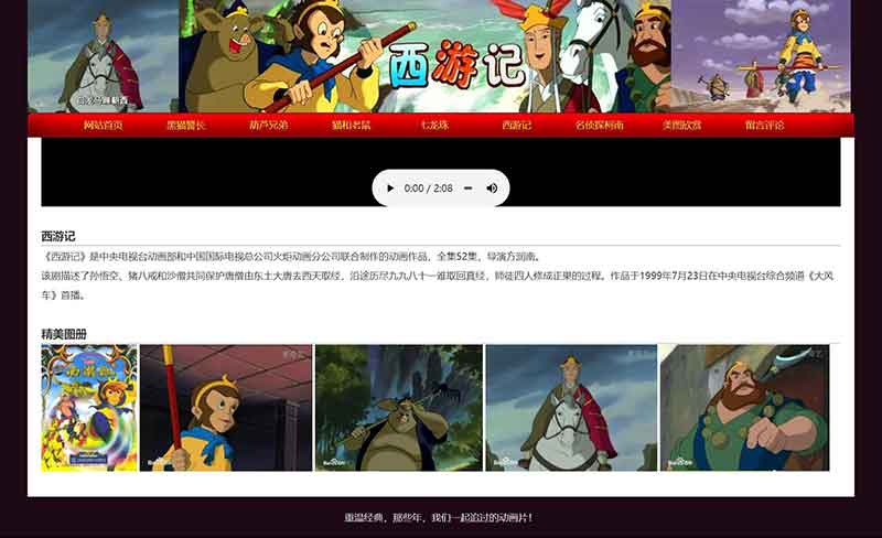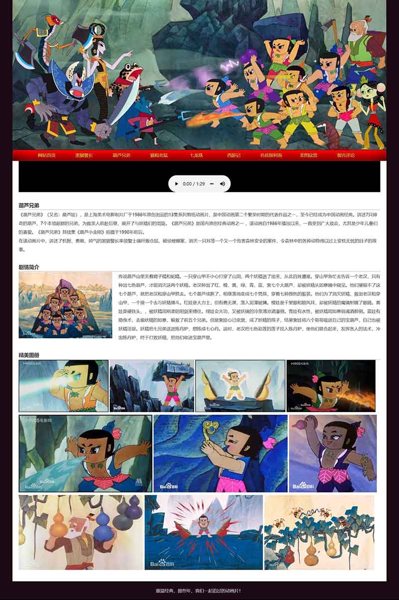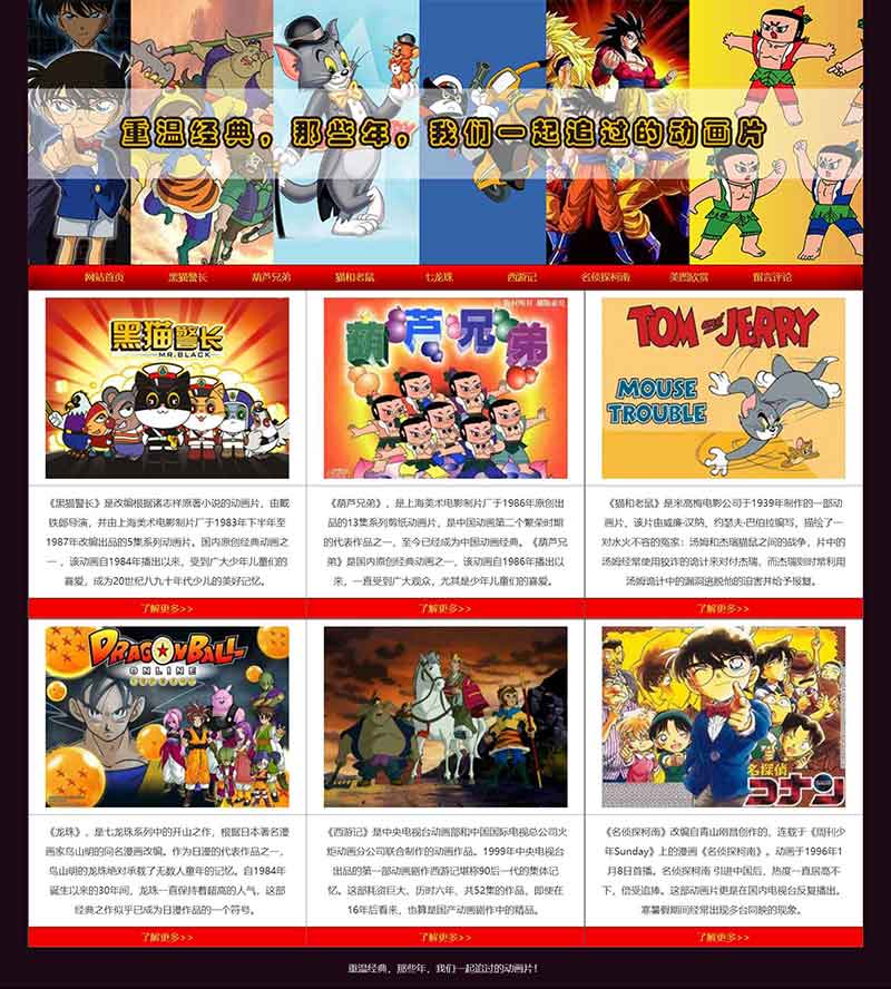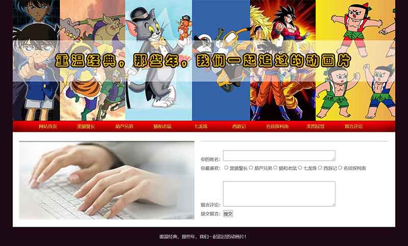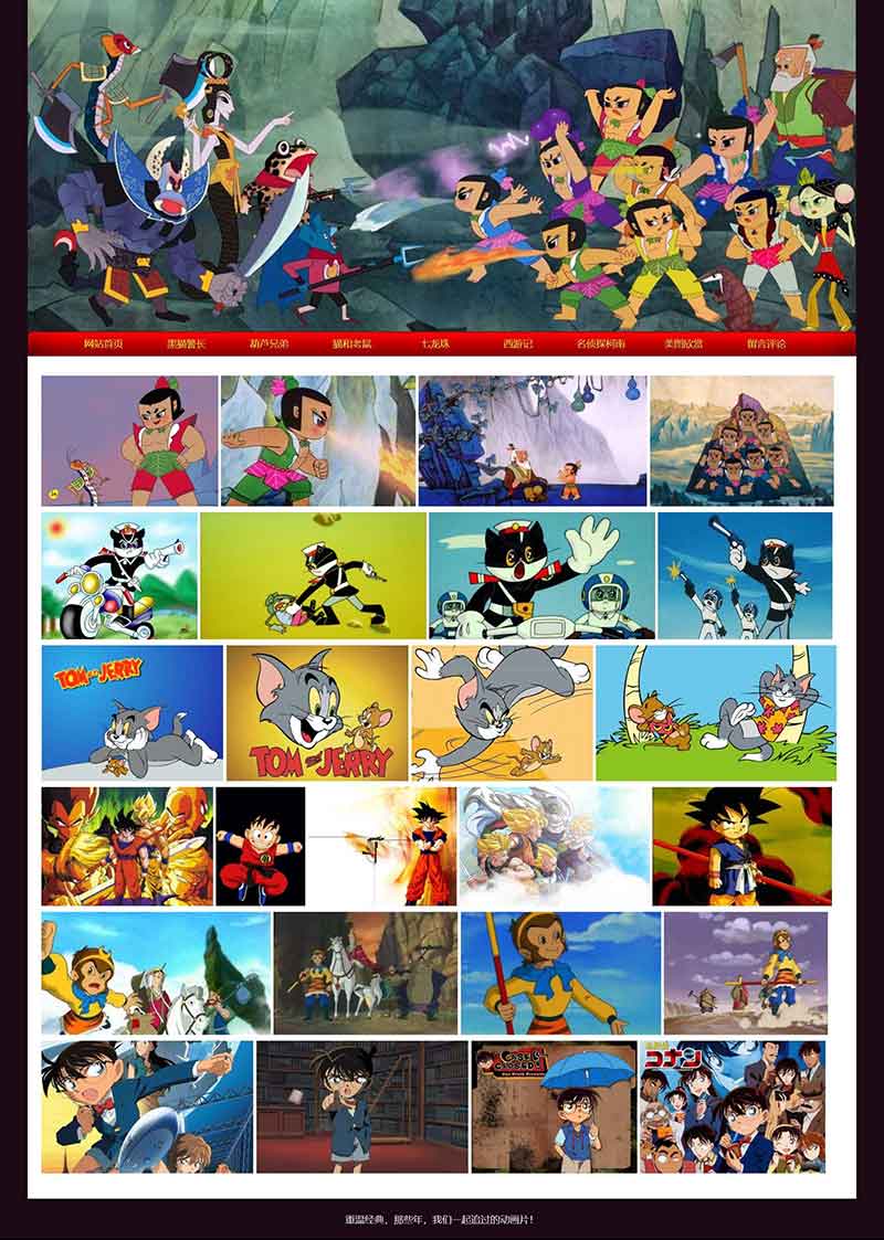 回顧兒時經(jīng)典動畫片題材學生網(wǎng)頁設(shè)計制作成品,作品使用DW采用表格技術(shù)布局,共9個頁面,包括1個首頁、6個動畫片介紹頁面、1個美圖頁面、1個留言表單頁面。其中每個動畫片介紹頁面有單獨的海報大圖、音樂、文字內(nèi)容介紹。整個作品內(nèi)容豐富,頁面美觀,技術(shù)運用合理。