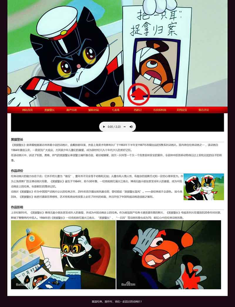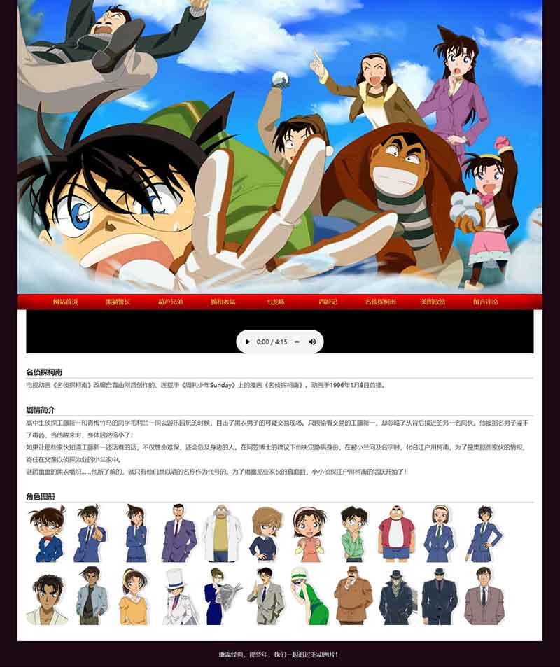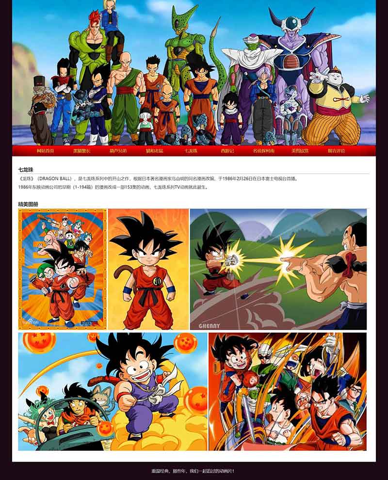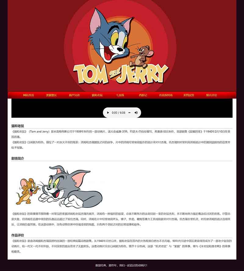 回顧兒時經(jīng)典動畫片題材學生網(wǎng)頁設(shè)計制作成品,作品使用DW采用表格技術(shù)布局,共9個頁面,包括1個首頁、6個動畫片介紹頁面、1個美圖頁面、1個留言表單頁面。其中每個動畫片介紹頁面有單獨的海報大圖、音樂、文字內(nèi)容介紹。整個作品內(nèi)容豐富,頁面美觀,技術(shù)運用合理。