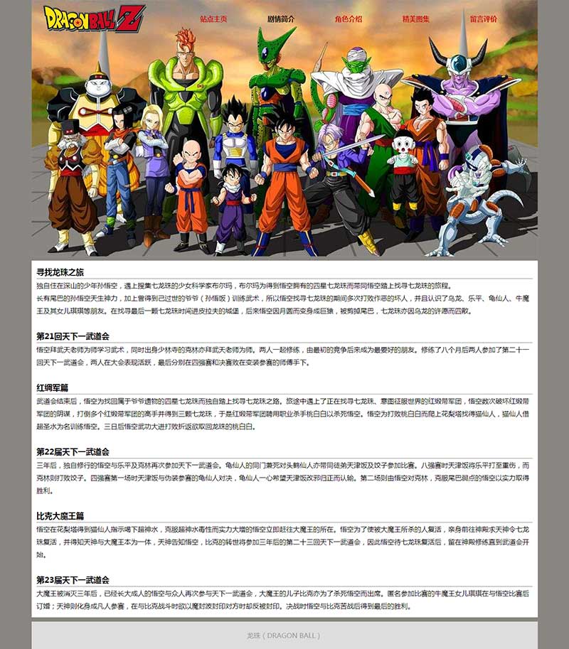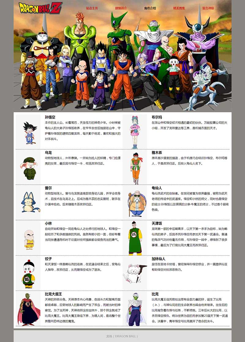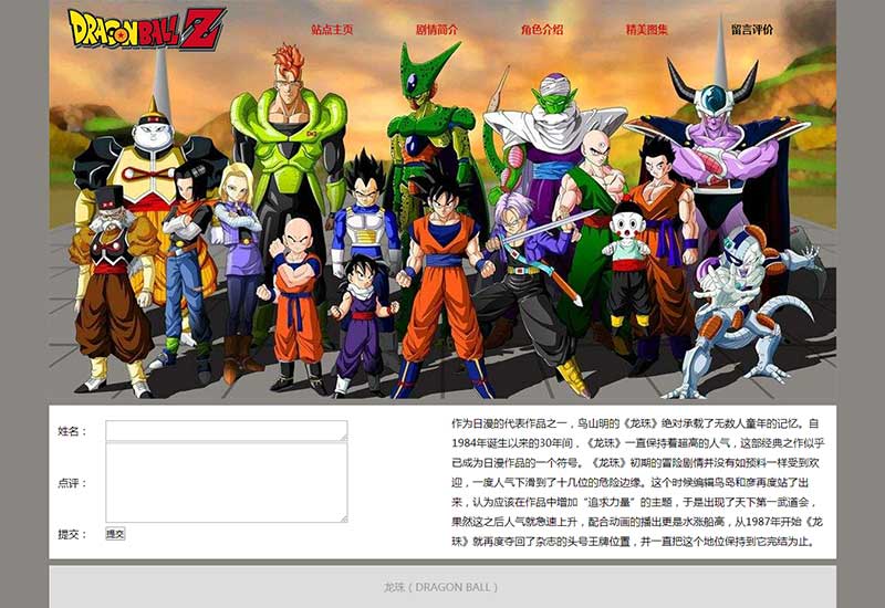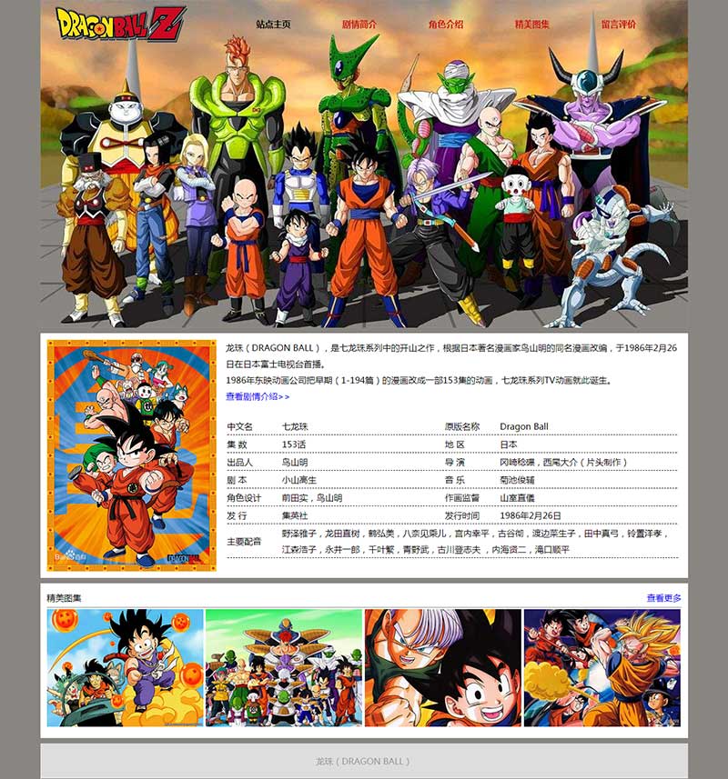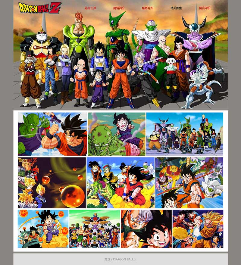 動畫片龍珠Dreamweaver學生網(wǎng)頁作品采用表格技術(shù)布局,共5個頁面,內(nèi)容包括:站點主頁、劇情簡介、角色介紹、精美圖集、留言評價。內(nèi)容收集于百度百科。首頁布局豐富,有LOGO、導(dǎo)航、頂部大圖背景、頁面背景顏色、中間部分插入表格(基本信息介紹表格)、下面圖片列表、底部版權(quán)信息等。作品很完善,做的比較細致,子頁面有簡單的文字內(nèi)容頁,和豐富的角色圖文頁面。表單留言頁面,按鈕加入了JavaScript彈窗反饋,首頁插入了背景音樂,打開首頁后,鼠標點擊任意地方,會啟動音樂播放。