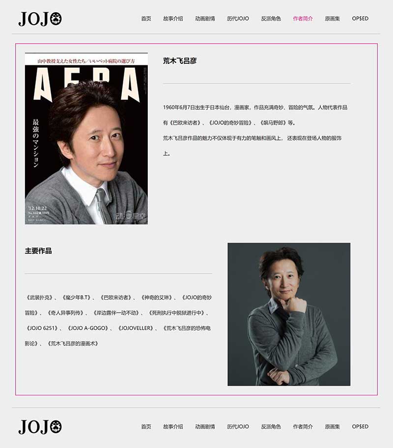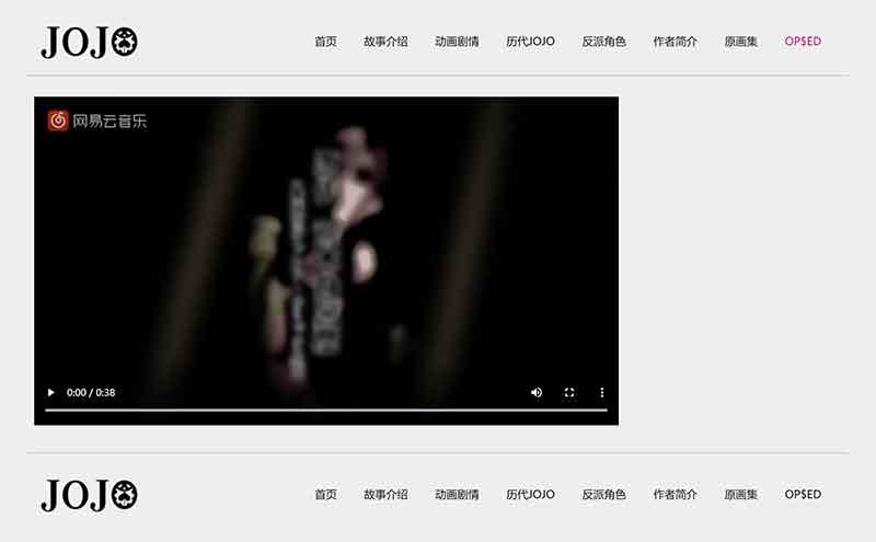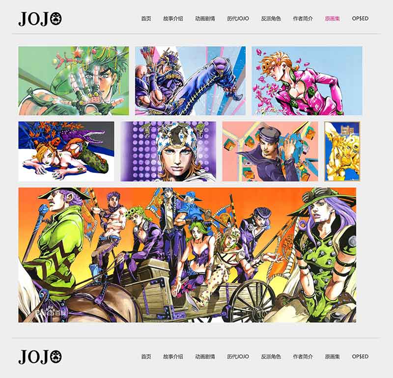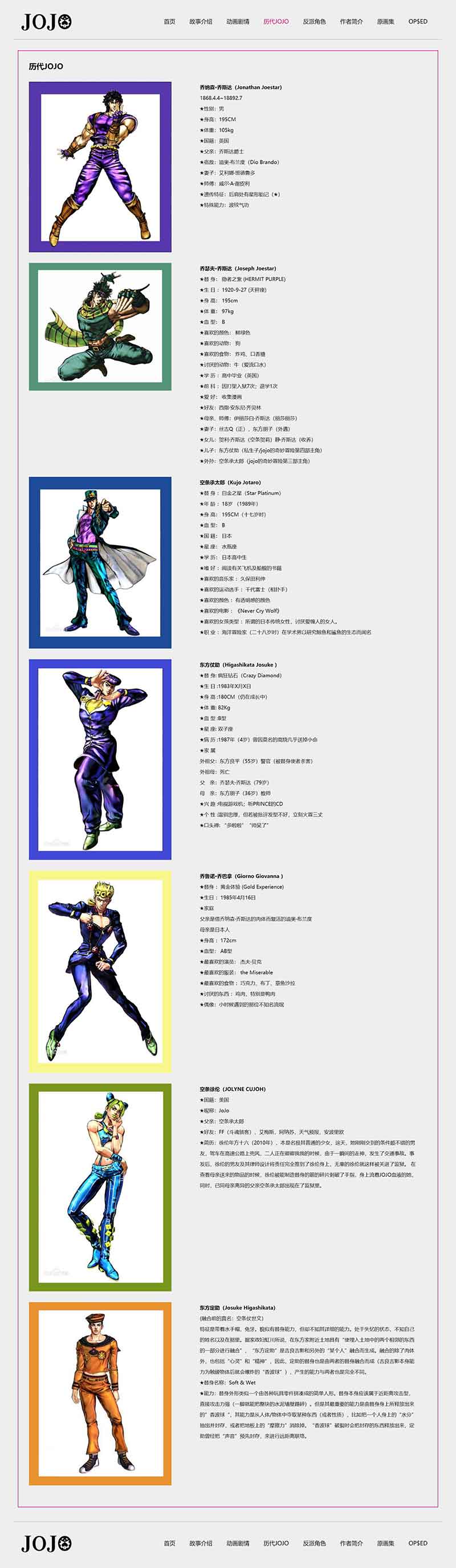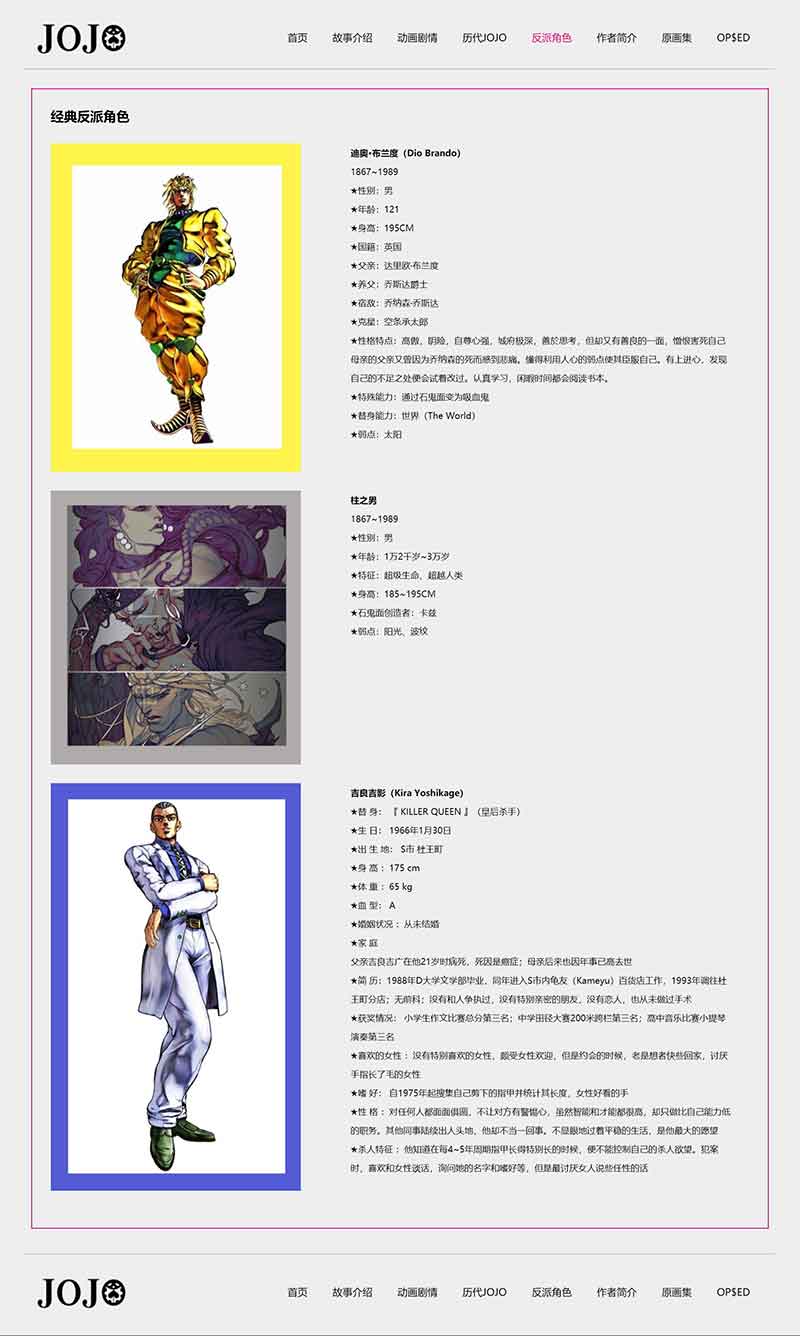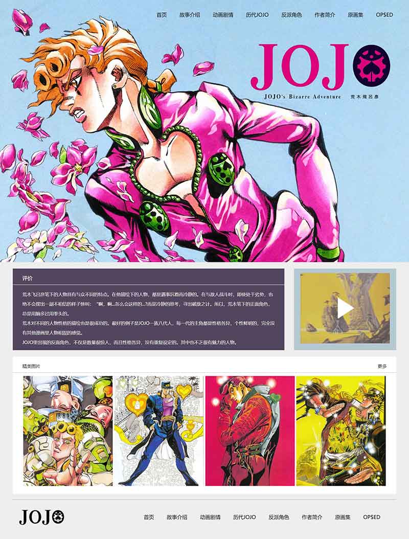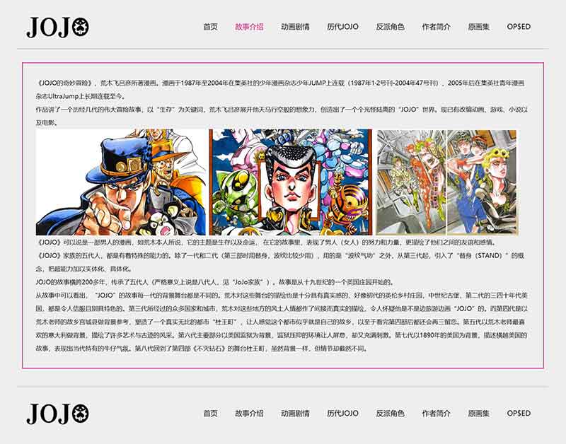 網頁內容豐富,整體內容包括首頁、故事介紹、電視動畫劇情、JOJO角色、反派角色、漫畫作者、圖集頁面、視頻頁面。作品整體頁面較長,所以底部也制作了底部導航,可以快速進入其他頁面,作品中制作了視頻頁面。