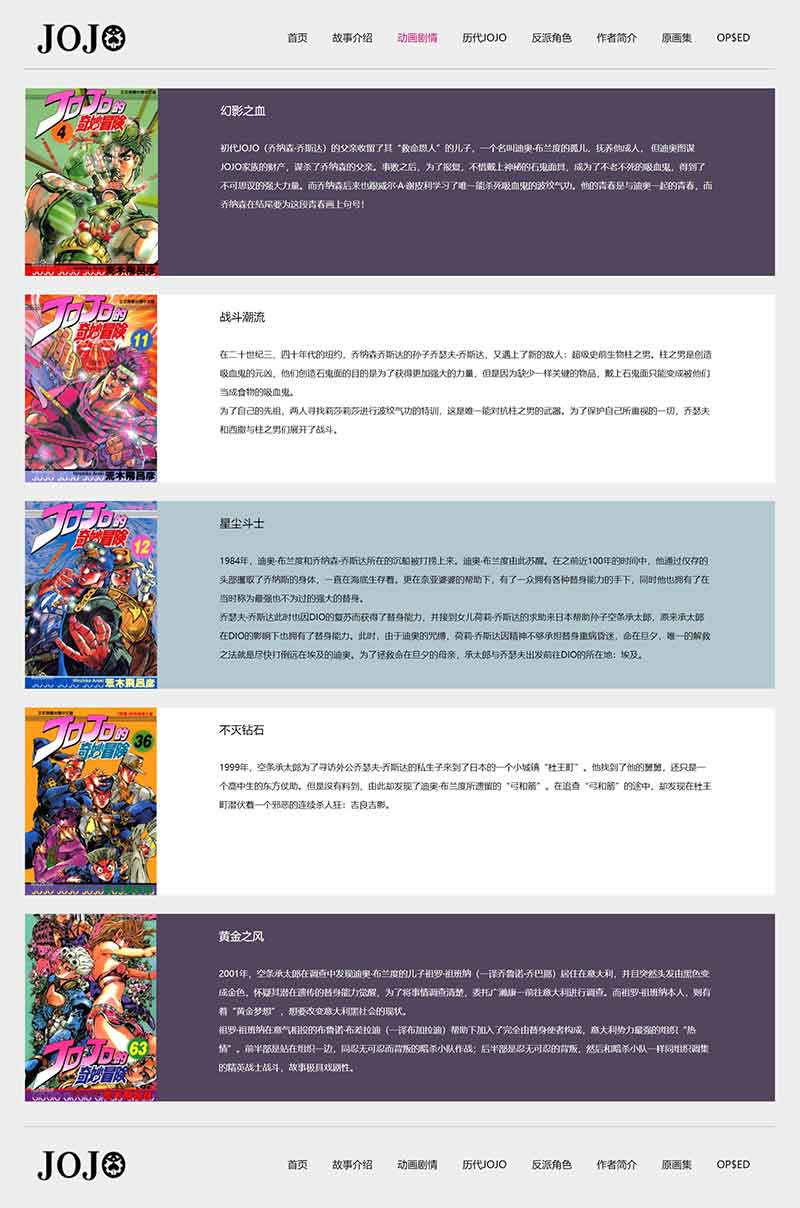 JOJO的奇妙冒險漫畫網頁-學生動漫網頁設計作品共8頁,采用DIV CSS布局制作設計,首頁與子頁面均采用了不同的頁面布局設計,首頁頂部大圖采用了100%自適應寬度制作,頂部導航設置了鼠標經過文字變色效果。