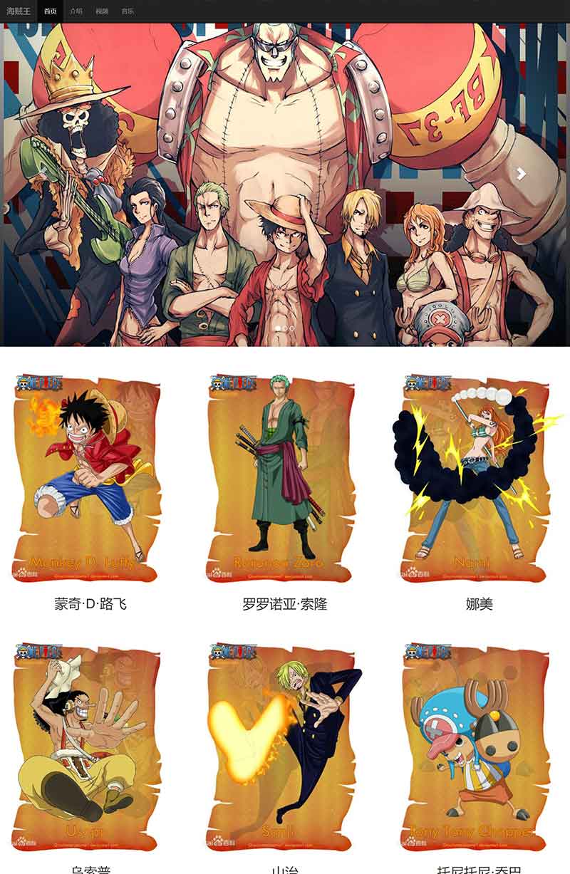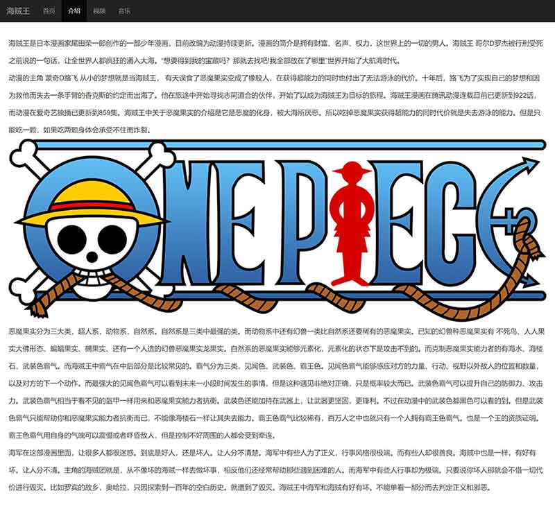 本作品為基于bootstrap框架制作的響應(yīng)式自適應(yīng)網(wǎng)頁,可自適應(yīng)PC、移動端。網(wǎng)頁題材為海賊王,整個成品共4個頁面,包括:首頁、圖文介紹頁面、視頻頁面、音樂播放器頁面。