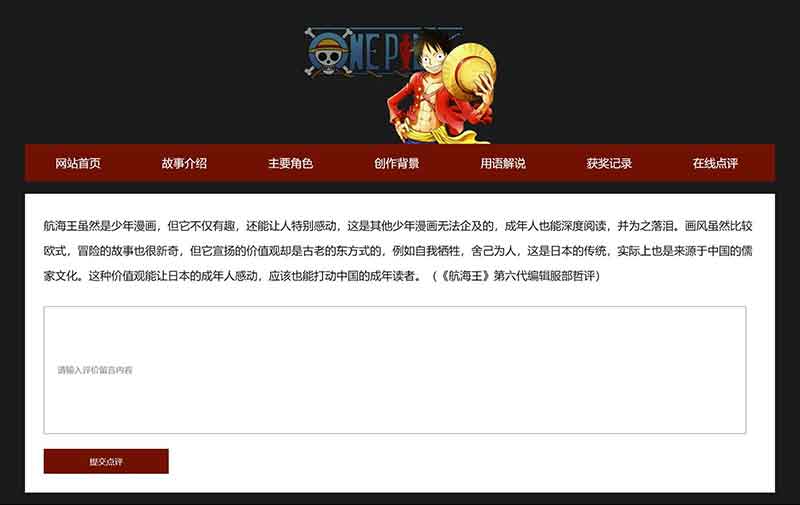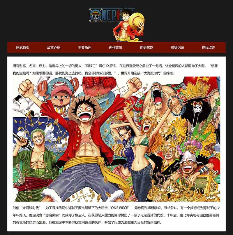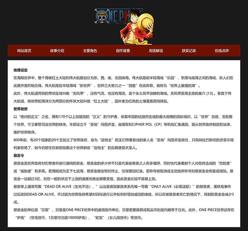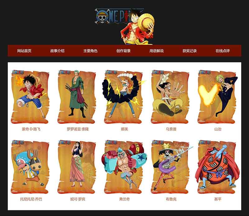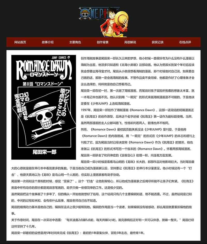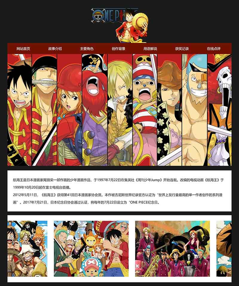 HTML海賊王靜態網頁設計作品采用DIV CSS制作,知識點主要應用了:網頁背景顏色、LOGO、導航欄目(鼠標經過背景變色)、BANNER、滾動圖片、圖文混排、圖片列表、留言表單等。頁面包括:網站首頁、故事介紹、主要角色、創作背景、用語解說、獲獎記錄、在線點評,共7個頁面。
