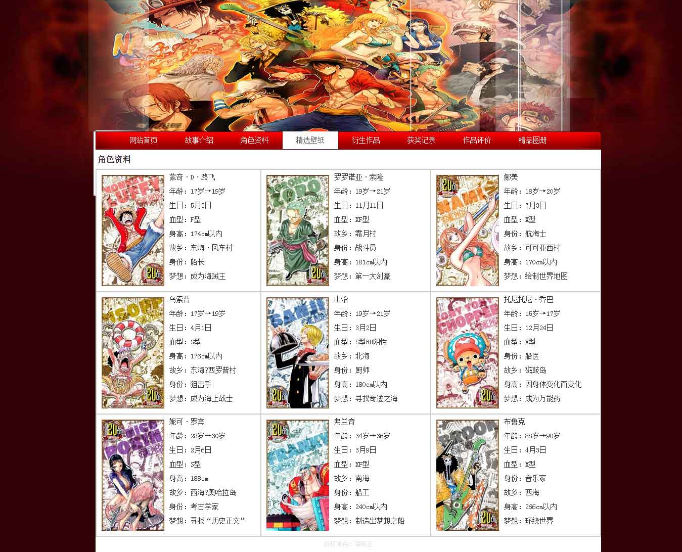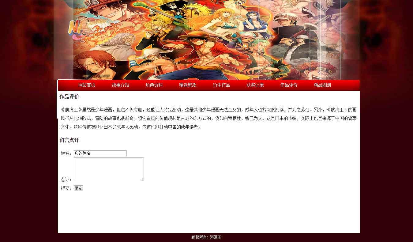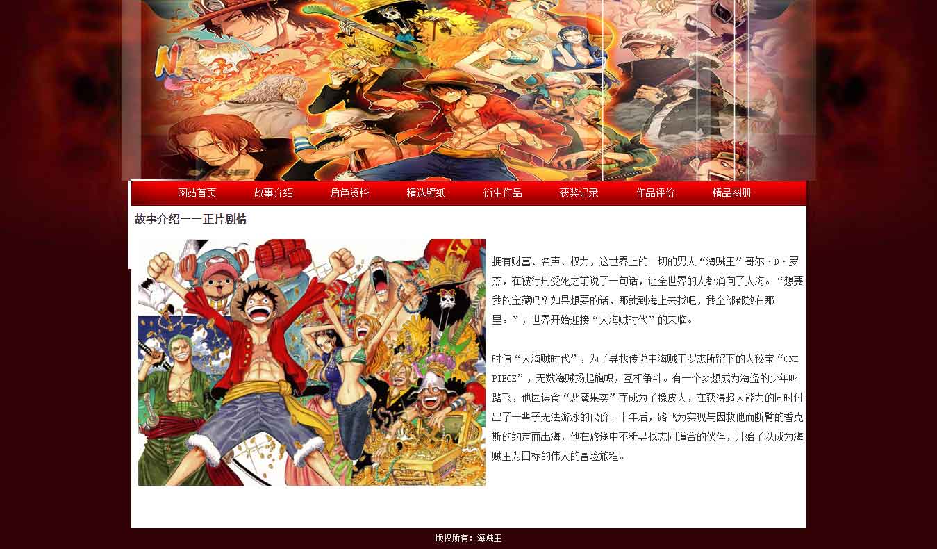 海賊王動漫學(xué)生網(wǎng)頁設(shè)計課程作品共8頁,使用Table表格布局制作,設(shè)置了網(wǎng)頁背景圖片,導(dǎo)航鼠標(biāo)經(jīng)過樣式,內(nèi)頁多種排版形式,制作了網(wǎng)頁留言表單頁面。網(wǎng)頁作品中所需的資料為網(wǎng)上搜集。