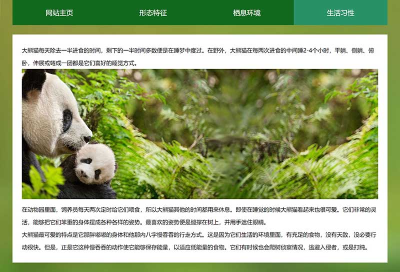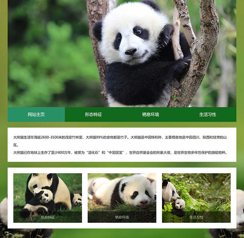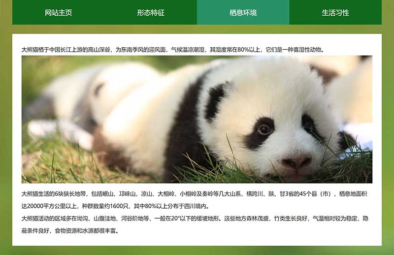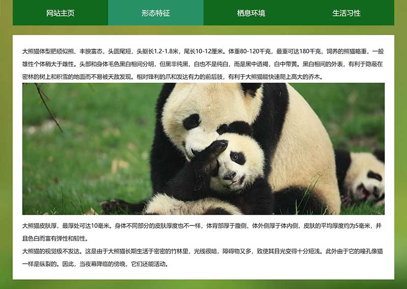 本學生網頁主題為介紹大熊貓形態特征、棲息環境、生活習性等,采用DIV CSS布局,共4個頁面。