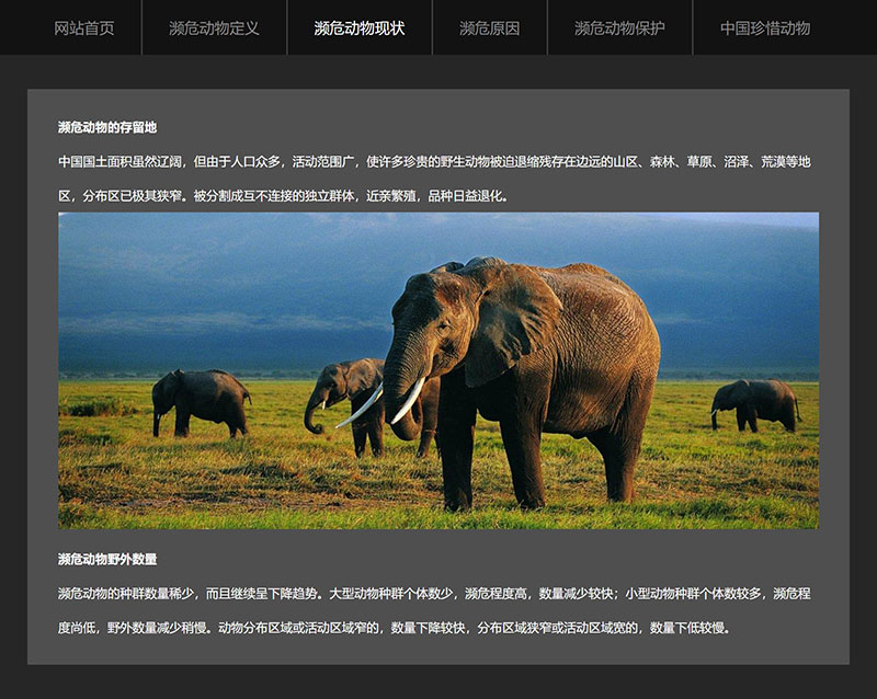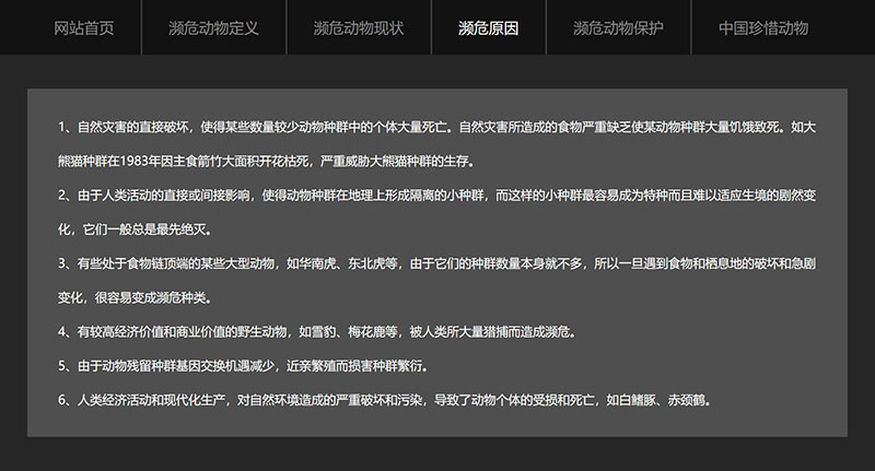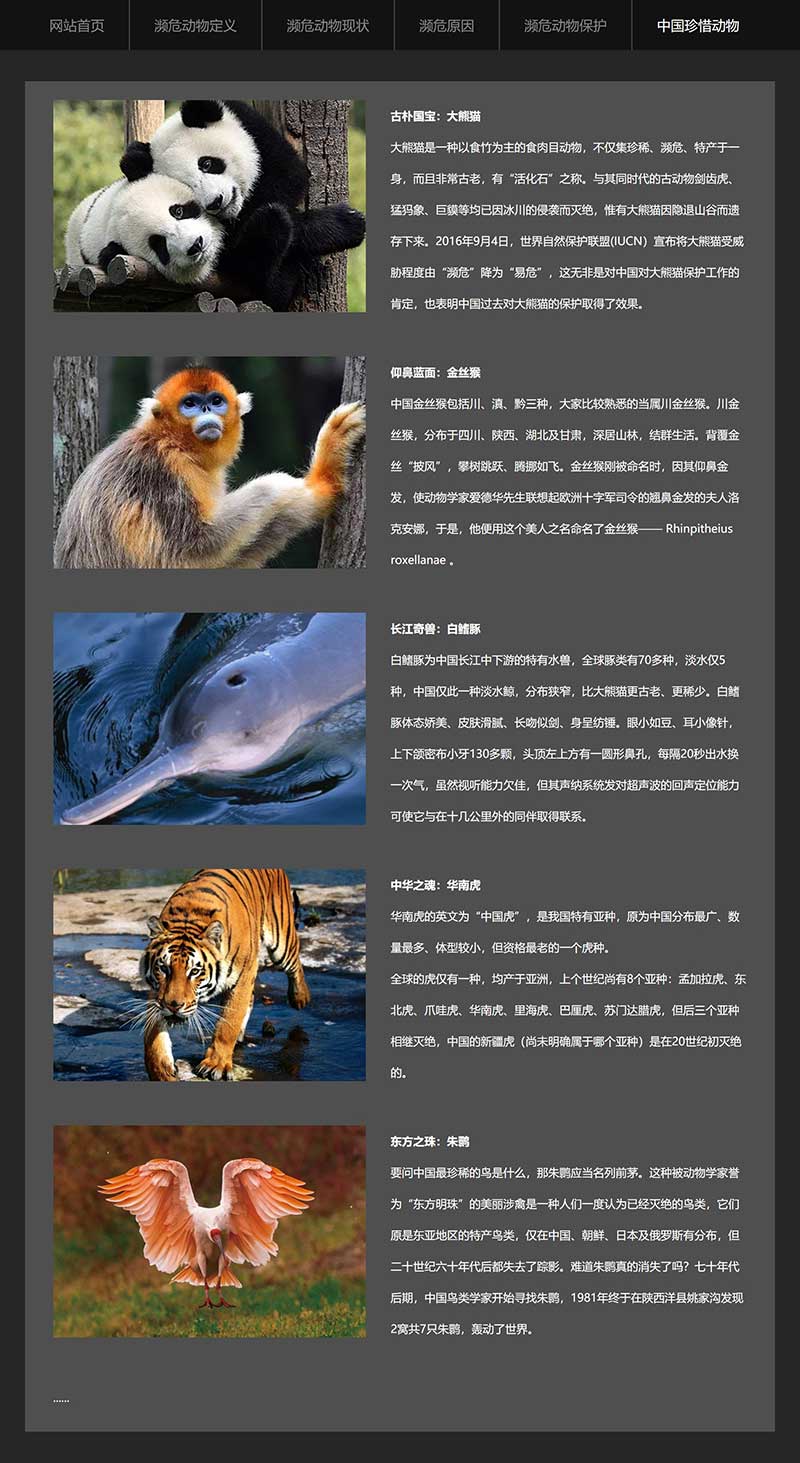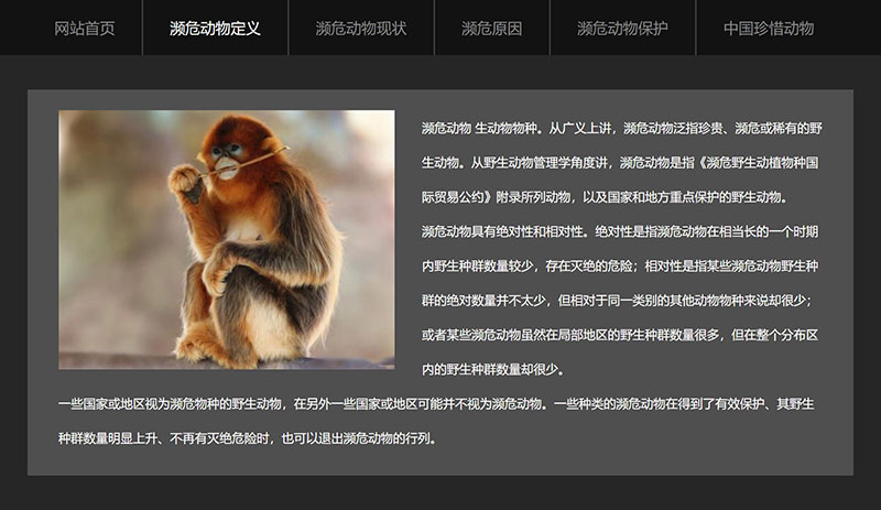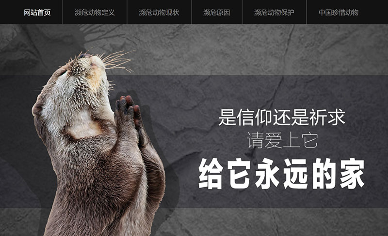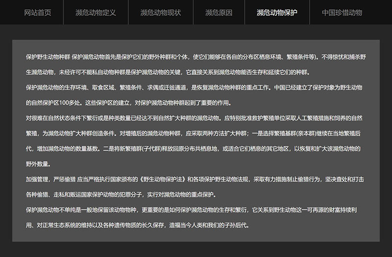 保護動物網頁設計作品內容圍繞瀕危動物制作,網頁作品包括網站首頁、瀕危動物定義、瀕危動物現狀、瀕危原因、瀕危動物保護、中國珍惜動物共計6個頁面。 網頁采用DIV CSS布局制作,頂部導航及BANNER大圖為100%自適應屏幕寬度,主體內容區寬度為1200PX,使用CSS設計了網頁背景顏色、導航鼠標經過及選中文字變色效果及導航分割線等。作品采用學生基礎DIV CSS水平設計,代碼簡單。