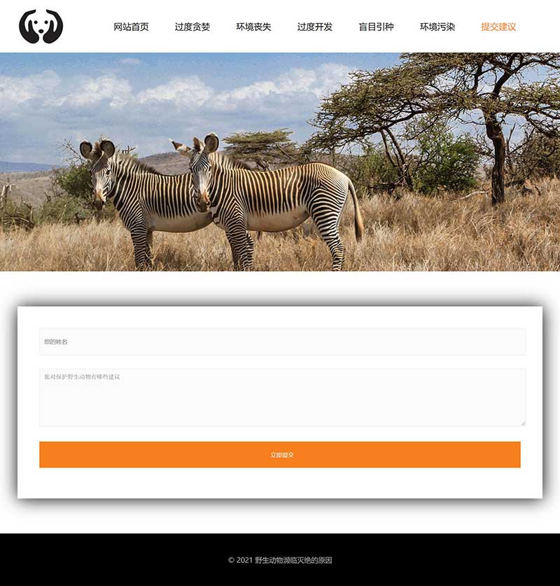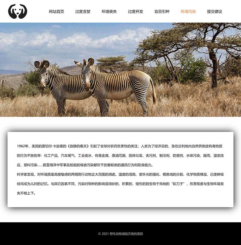 此大學生網頁設計作業成品主題內容為野生動物瀕臨滅絕的原因。網頁作品主要包括:網站首頁、過度貪婪、環境喪失、過度開發、盲目引種、環境污染、提交建議共7個頁面。