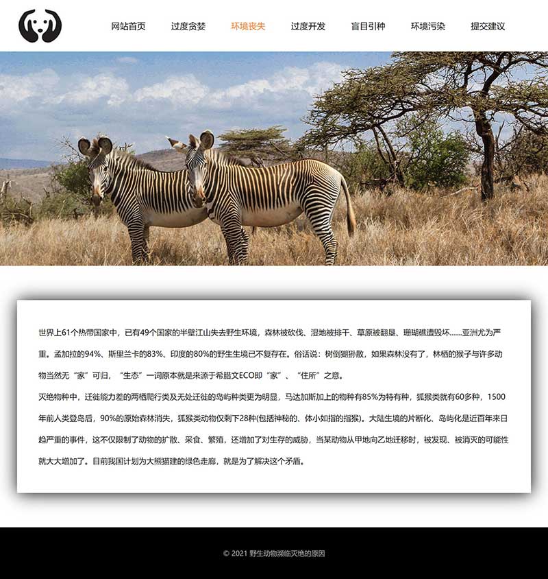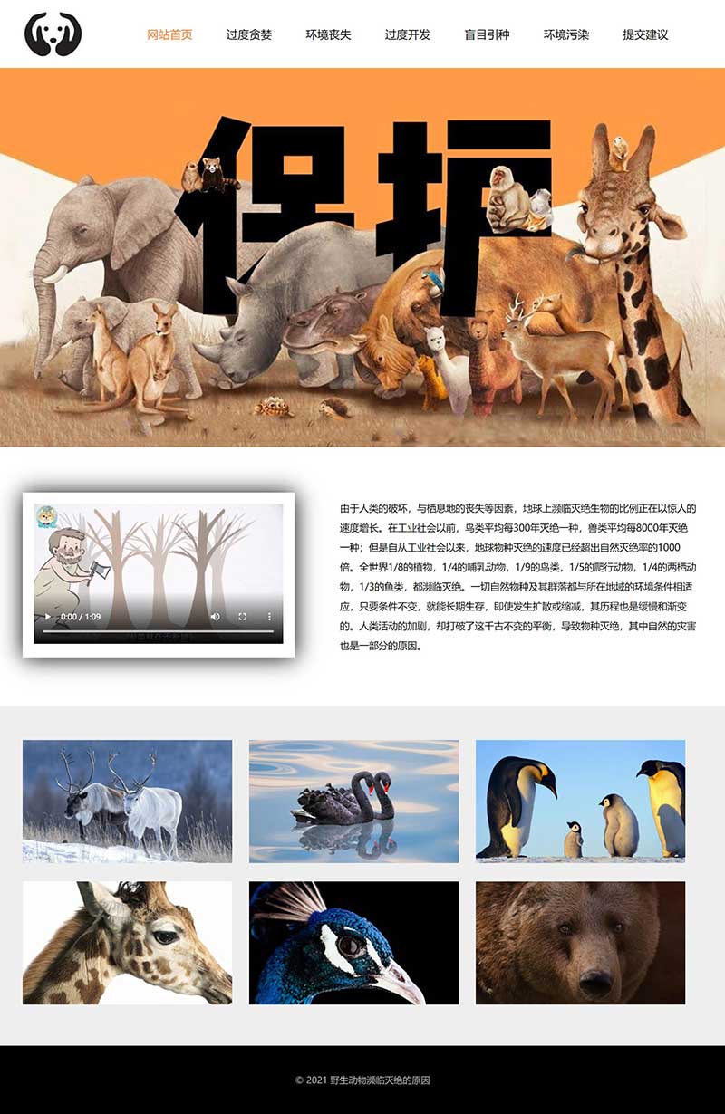 網頁整體頂部區域包括LOGO、導航、BANNER大圖,底部。首頁添加了視頻,視頻底部制作了陰影效果。首頁最下方為圖片列表。其他子頁面為文字頁面,介紹了引起動物瀕臨滅絕的各種原因。提交建議頁面制作了靜態留言表單。