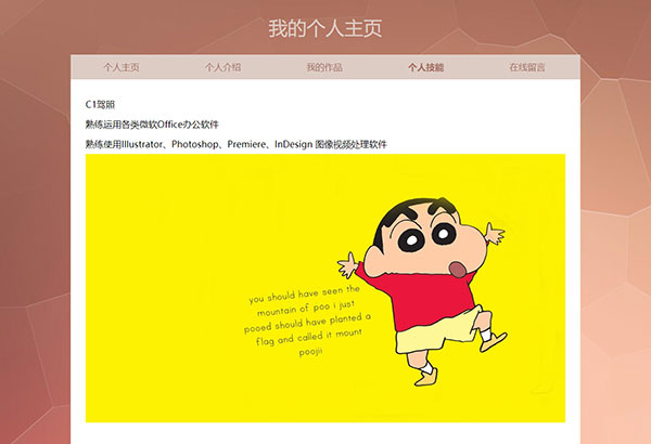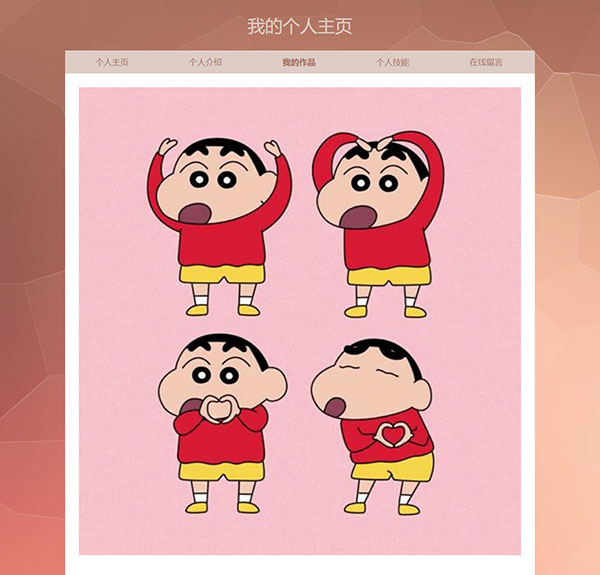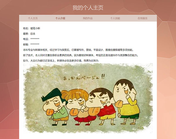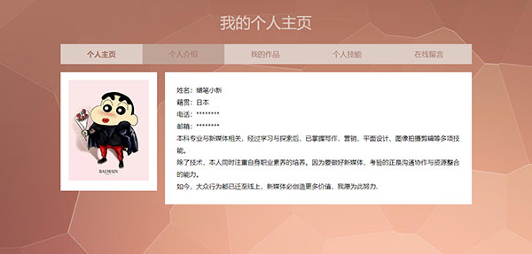 學(xué)生個人主頁網(wǎng)站模板下載 個人簡歷網(wǎng)... ¥20    個人博客網(wǎng)頁 | 抗疫健康網(wǎng)頁 | 保護(hù)動物網(wǎng)頁 | 寵物花草網(wǎng)頁 | 家鄉(xiāng)旅游網(wǎng)頁 | 人物明星網(wǎng)頁 | 節(jié)日環(huán)保網(wǎng)頁 | 影視音樂網(wǎng)頁 | 校園班級網(wǎng)頁 | 動漫游戲網(wǎng)頁 | 文學(xué)文化網(wǎng)頁 | 電子商務(wù)網(wǎng)頁