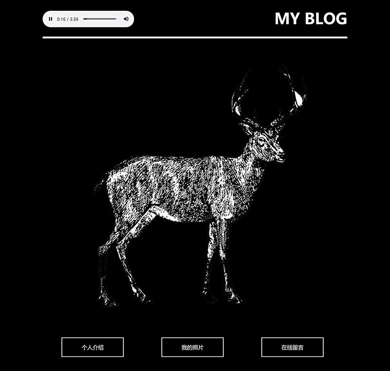 首頁插入了網頁背景音樂,可以手動播放及關閉。首頁底部插入了導航欄目,每個導航設置了白色邊框,鼠標經過時,欄目字體會加粗變化。