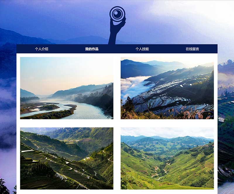 網頁整體寬度為1100PX,有LOGO、導航欄、內容區。使用CSS設置了頁面背景圖片,網頁作品中的文字內容可以直接使用Dreamweaver、HBuilder、NotePAD等軟件編輯修改為個人信息,圖片可直接在源文件中替換。