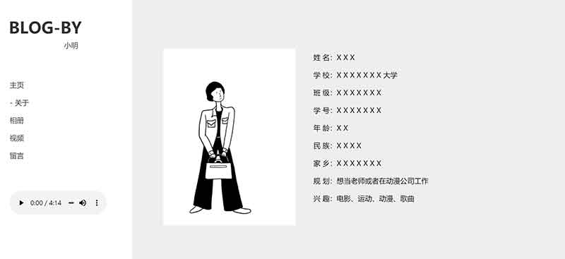 極簡風(fēng)格大學(xué)生個人主頁網(wǎng)頁設(shè)計作業(yè)模板采用DIV CSS布局制作,作品共5個頁面,可根據(jù)需求后期自己增減。目前5頁分別為首頁、個人介紹頁面、相冊頁面、視頻頁面、留言表單頁面。