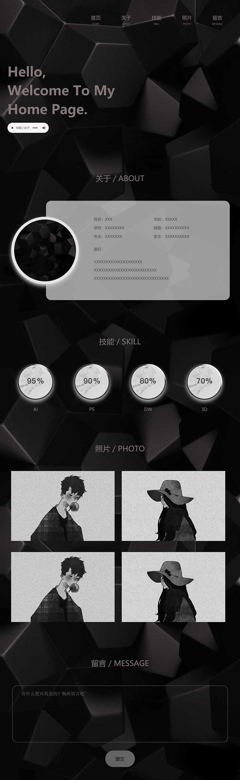 學生個人主頁博客靜態網頁作品采用DIV布局制作,單頁面頁內跳轉類型網頁,頁面內容主要包括關于、技能、照片、留言。網頁中的頂部導航使用CSS制作了鼠標經過變色及下劃線效果。