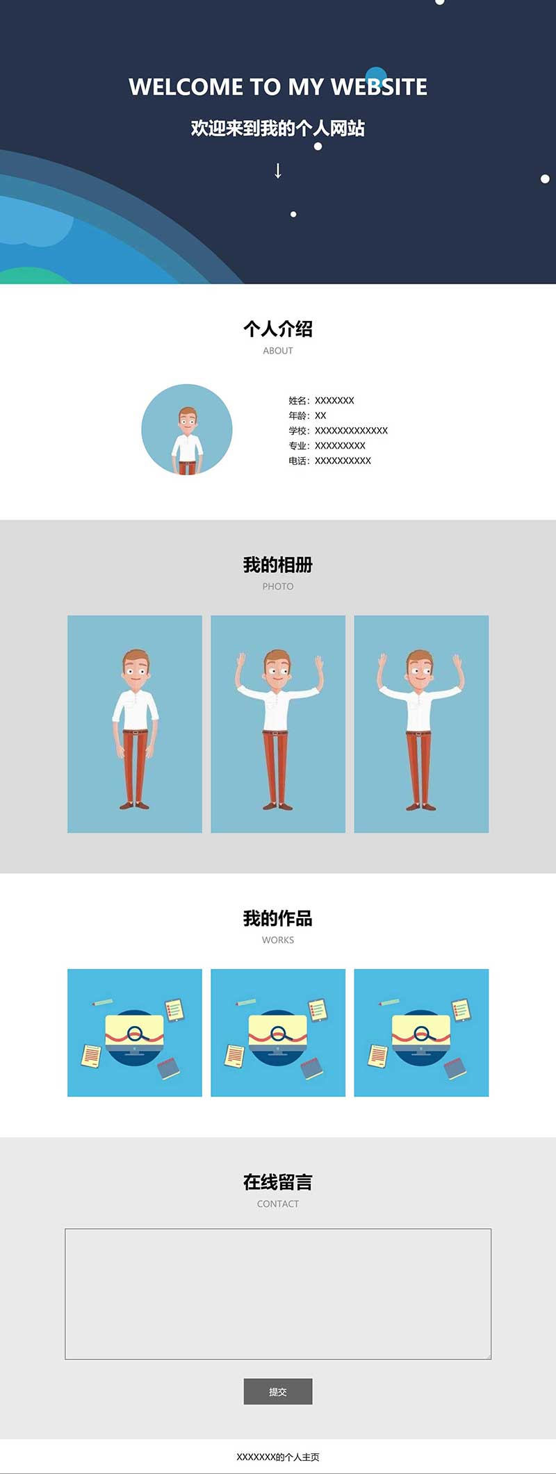 大學(xué)生個人介紹網(wǎng)頁制作html單頁面作品,網(wǎng)頁采用DIV CSS布局制作,所有內(nèi)容集到一個頁面,主要內(nèi)容包括:banner、頭像、個人介紹、我的相冊、我的作品、在線留言、腳部版權(quán)。底部插入了在線留言表單,網(wǎng)頁布局簡單干凈。作品下載后可自行將文字、圖片等內(nèi)容修改替換為個人的。