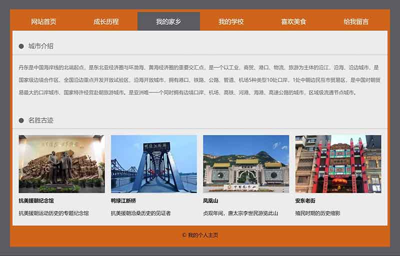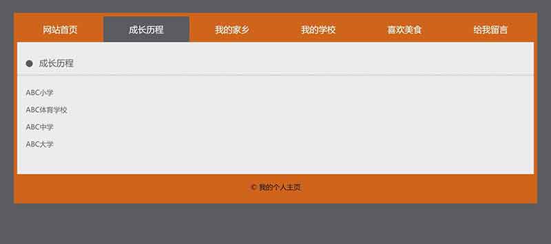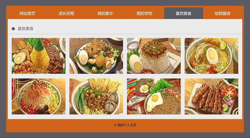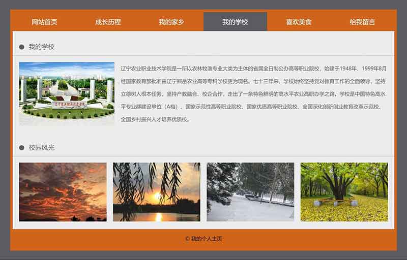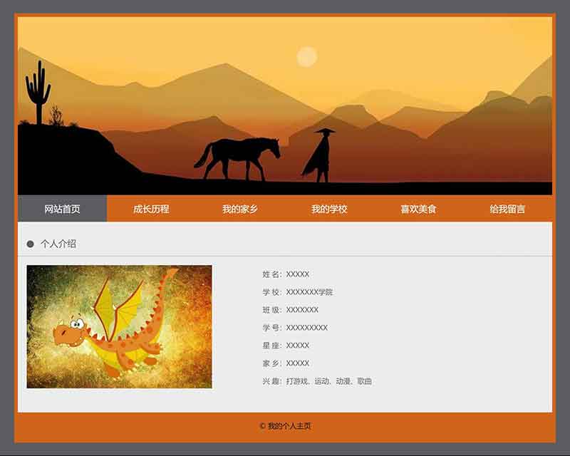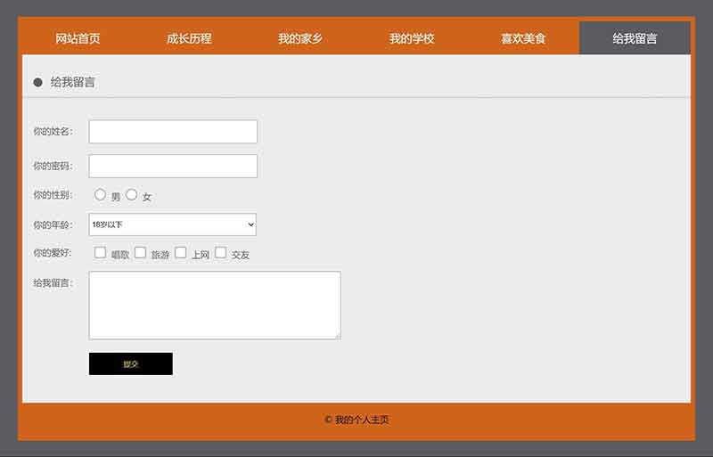 學生html個人網頁制作成品簡單模板采用DIV CSS布局制作,包括網站首頁、成長歷程、我的家鄉(xiāng)、我的學校、喜歡美食、給我留言,共6個頁面,導航及各個頁面的圖片及文字均可自行修改替換。其中導航欄的位置使用CSS設置了鼠標經過及選中背景變色,給我留言是制作了一個表單頁面,有單選、多選、下拉、單行文本、多行文本等。