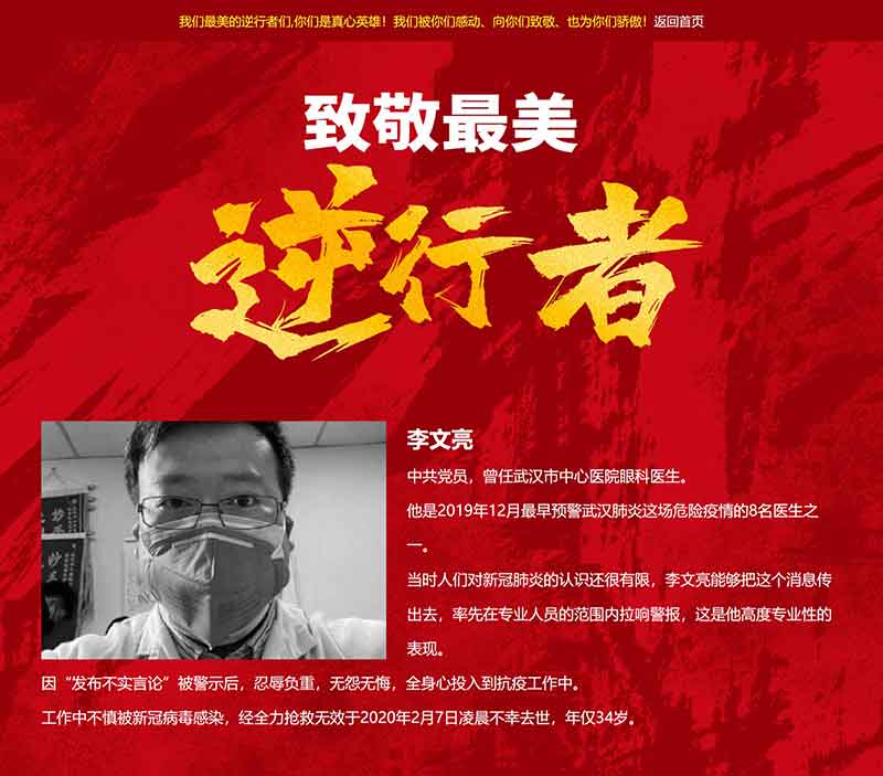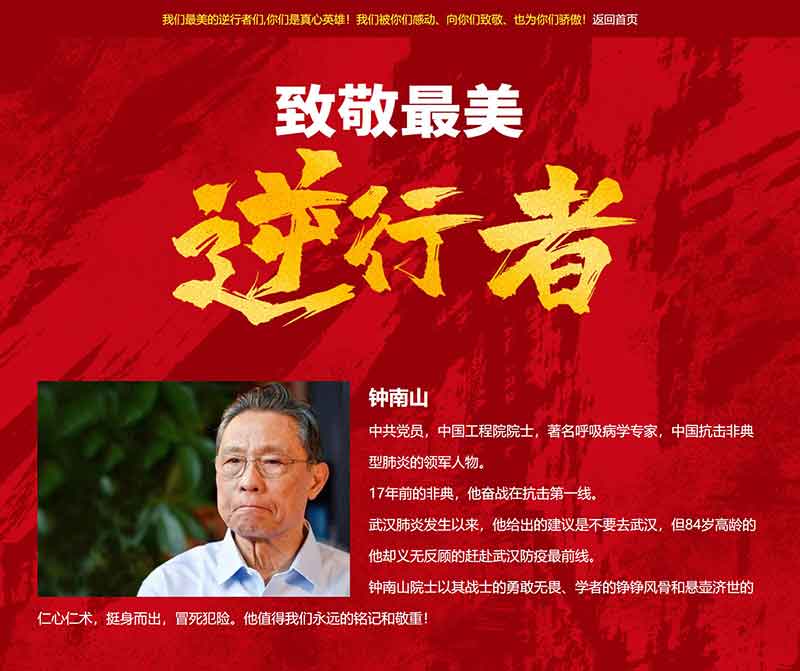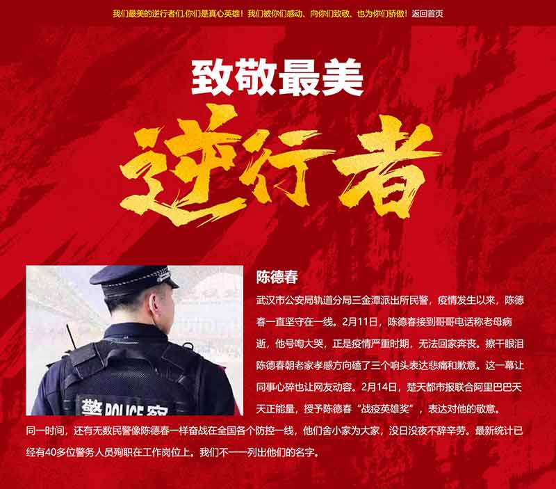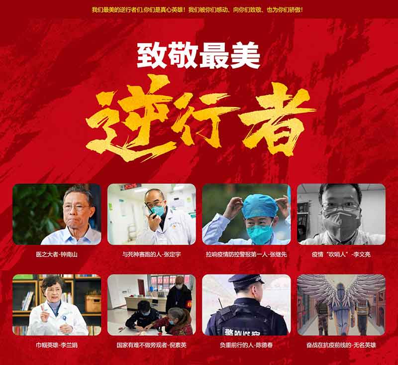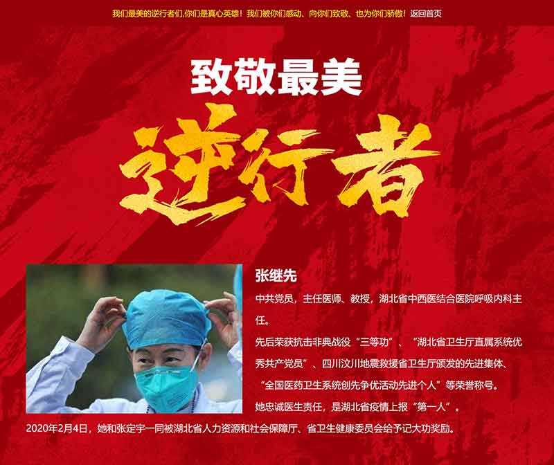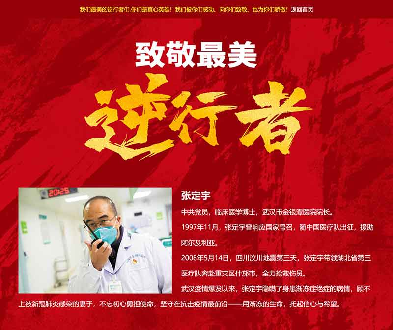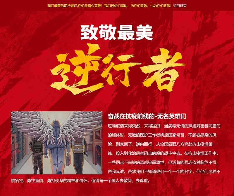 致敬最美逆行者大學(xué)生網(wǎng)頁設(shè)計作品采用DIV CSS布局,共9個頁面,包括1個首頁和8個感動人物介紹頁面。作品采用大學(xué)生基礎(chǔ)水平制作,應(yīng)用了以下網(wǎng)頁知識點:網(wǎng)頁背景圖、圖片列表、字體大小顏色設(shè)置、圖文混排、子頁面返回首頁超鏈接等。