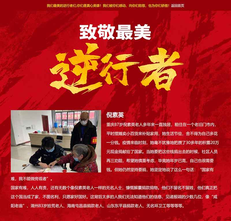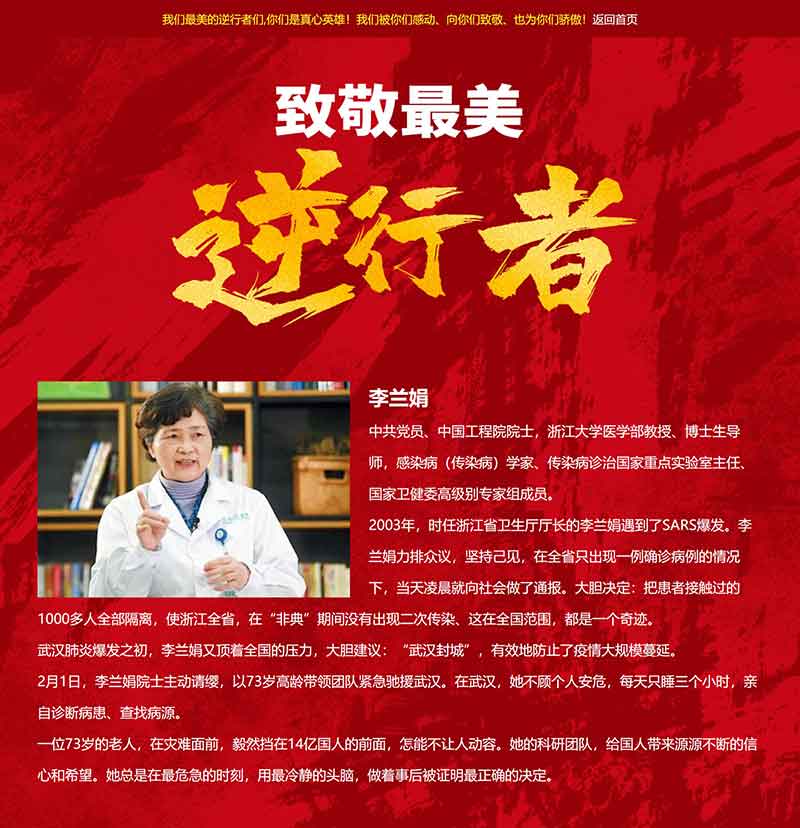 網(wǎng)頁設(shè)置了與題材相符的背景圖,頂部DIV背景條寬度為100%,頁面主體內(nèi)容區(qū)域?qū)挾葹楣潭?200PX,首頁可以點擊感動人物圖片列表進入對應(yīng)的人物詳情介紹頁面,人物介紹頁面頂部制作了點擊反饋首頁的超鏈接。