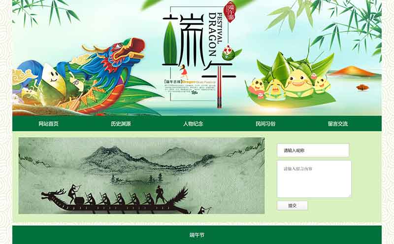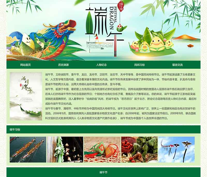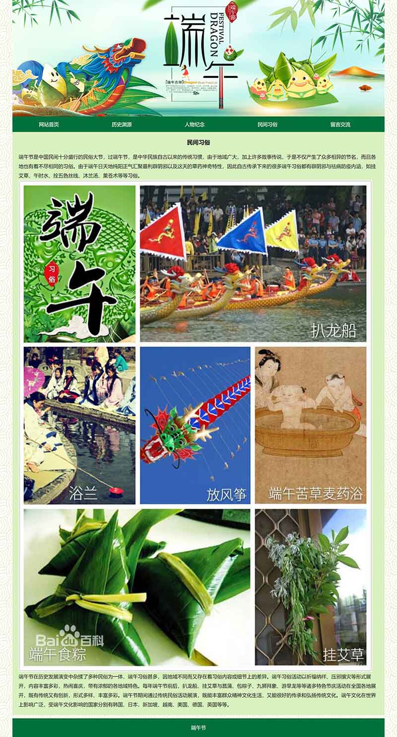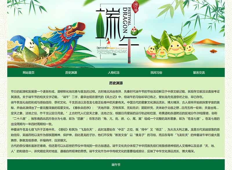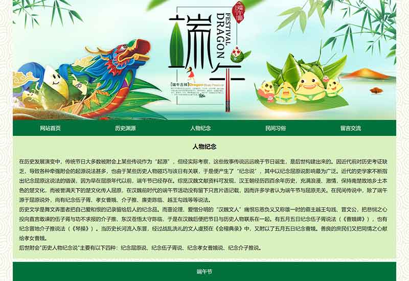 學(xué)生端午節(jié)網(wǎng)頁(yè)設(shè)計(jì)作業(yè)制作使用的DIV CSS布局,內(nèi)容方面介紹了端午節(jié)歷史淵源、人物紀(jì)念、民間習(xí)俗等方面。共5個(gè)頁(yè)面,制作了留言表單頁(yè)面。網(wǎng)頁(yè)整體使用CSS插入了淺色條紋背景圖片重復(fù)平鋪。網(wǎng)頁(yè)代碼布局簡(jiǎn)單,基礎(chǔ)學(xué)生網(wǎng)頁(yè)設(shè)計(jì)水平,無(wú)特效。