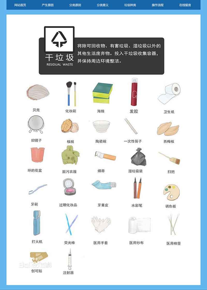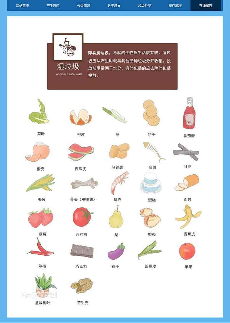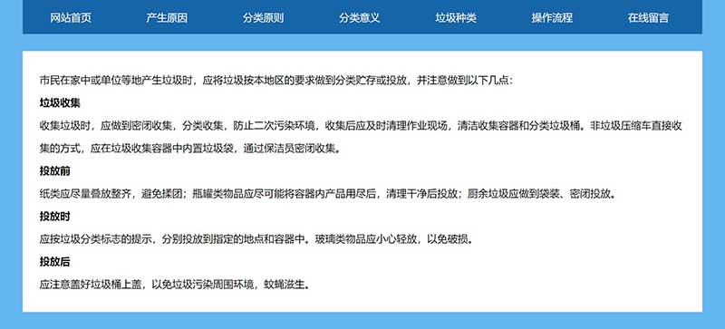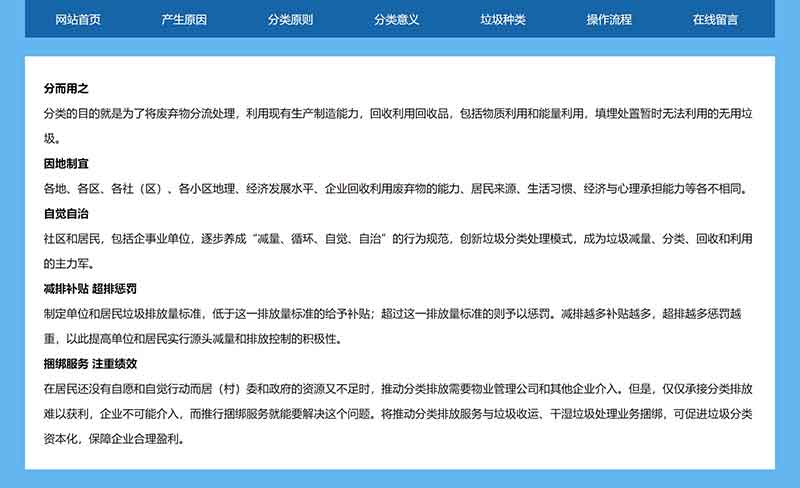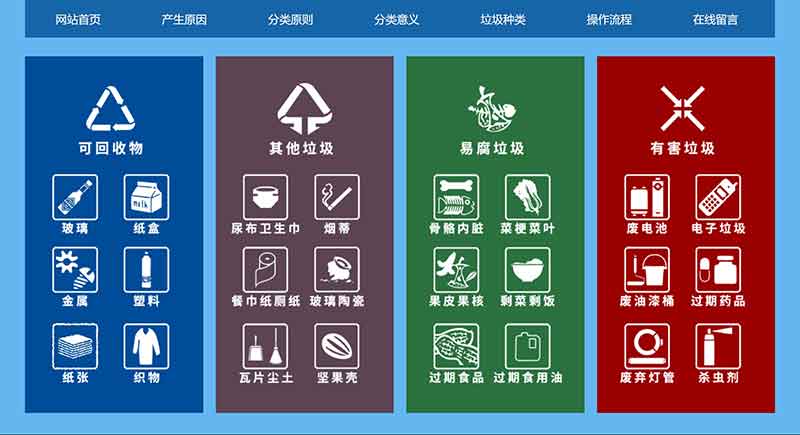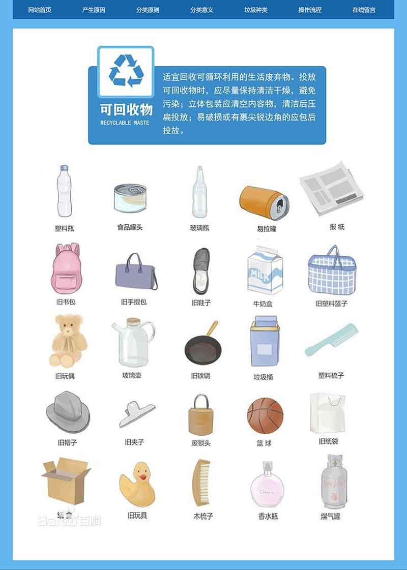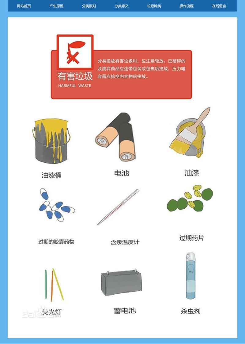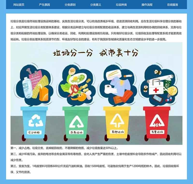 垃圾分類網頁設計作品采用DIV CSS布局制作,三層結構,共11個頁面(1個首頁、6個二級頁面、4個三級頁面)網頁內容包括:網站首頁、產生原因、分類原則、分類意義、垃圾種類、操作流程、在線留言。其中三級頁面(垃圾種類詳細介紹頁面插入的整張圖片海報)