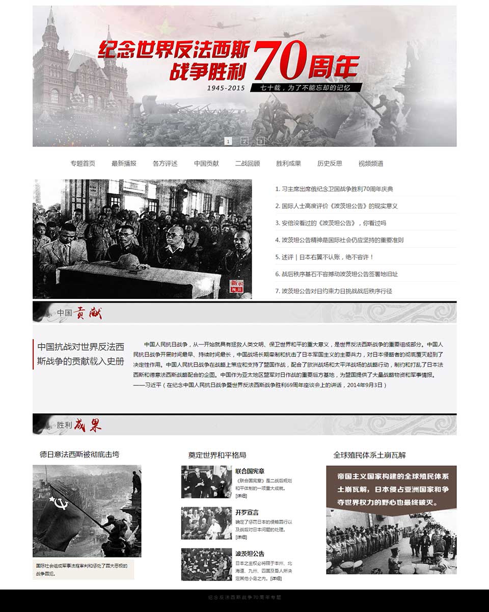 反法西斯戰爭70周年題材大學生網頁設計成品JQ特效:成品共1個頁面,采用DIV+CSS制作,共2個jquery特效,一是圖片百葉窗輪播切換jquery特效;二是圖片鼠標經過圖片放大鏡jquery特效。布局略復雜,特效較多,可學習參考。