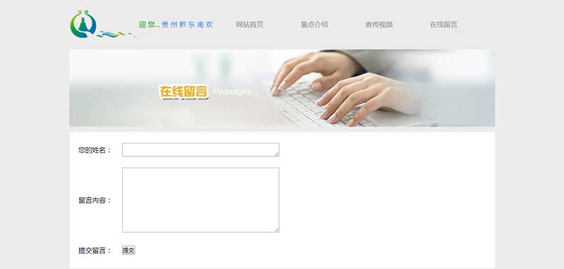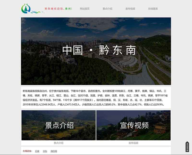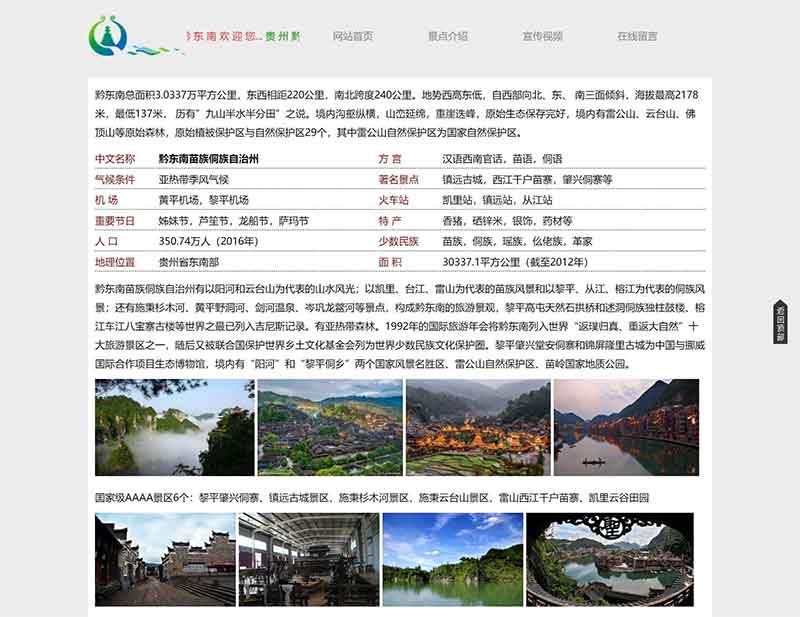 黔東南城市旅游題材學生網頁設計成品,作品使用Dreamweaver采用table表格布局制作,包括首頁、景點、視頻、留言共4個頁面,頂部區域加入了滾動文字,底部有外部鏈接,導航欄目簡單制作了鼠標經過變色。子頁面采用視頻、留言表單、表格、圖文 等多種內容展示形式。