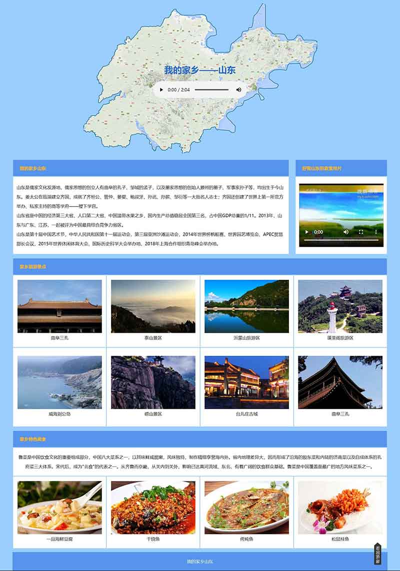 大學生我的家鄉——山東網頁設計作品使用Dreamweaver軟件由表格技術布局制作完成,單頁面作品,題材為我的家鄉山東,TABLE布局,DW制作。嵌入了背景音樂和與題材相符的視頻素材。頁面內容豐富,涵蓋了地圖、家鄉介紹、宣傳片、景點介紹、美食介紹及底部版權區的制作,頂部插入了背景音樂。