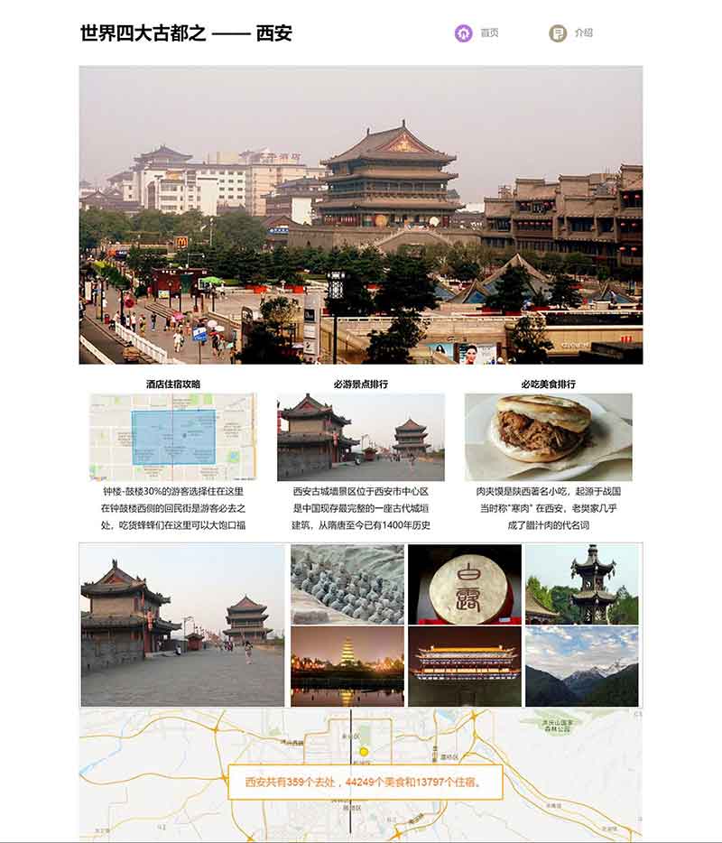 大學生我的家鄉(xiāng)網(wǎng)頁設(shè)計作品題材為西安旅游介紹,網(wǎng)頁由表格布局制作,包括首頁和介紹子頁面,共2個頁面,作品比較簡單,文件中包括2個頁面的Photoshop源圖文件,如果不需要可以直接刪除,不影響網(wǎng)頁運行。