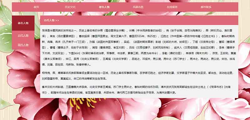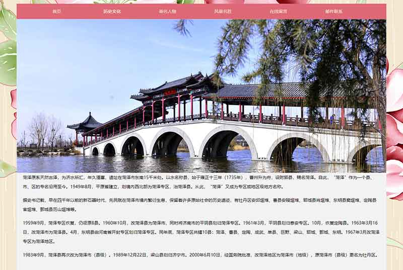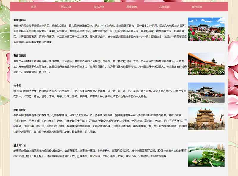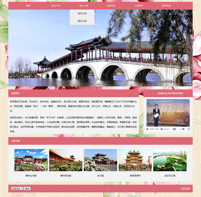 本作品由DIV+CSS制作,主題為中國牡丹之都-山東菏澤介紹的網頁,作品共6個頁面,頂部導航使用js制作了下拉菜單,首頁加入了視頻、滾動文字及跳轉菜單。所有頁面都制作了網頁背景,有留言表單頁面。作品含800字左右設計報告一份。