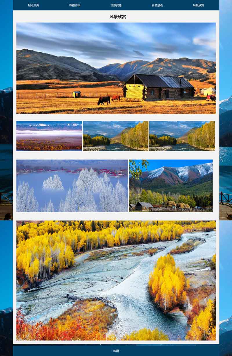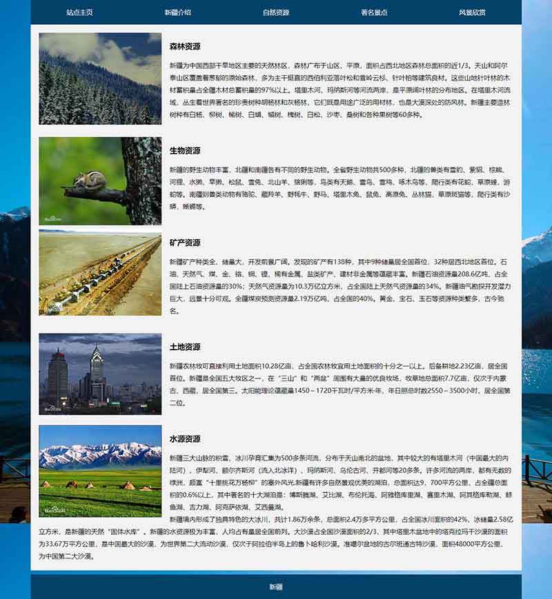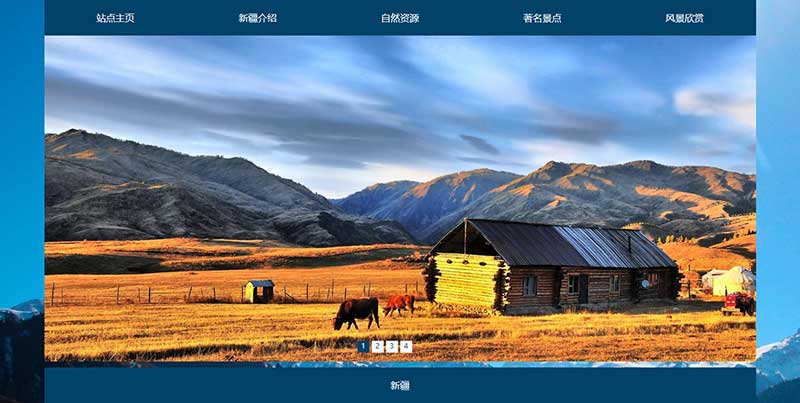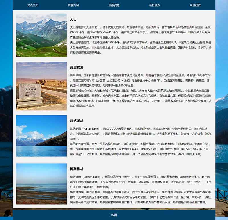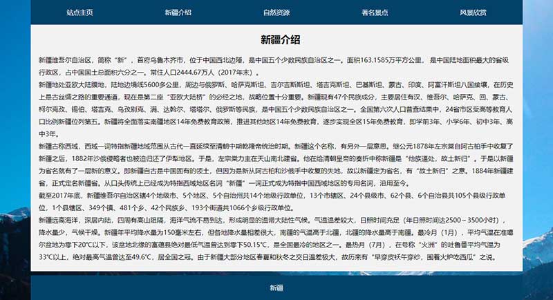 網(wǎng)頁作業(yè)作品題材為新疆地區(qū)介紹網(wǎng)站,使用DIV+CSS布局制作,共5個(gè)頁面,首頁使用js制作了輪播大圖。