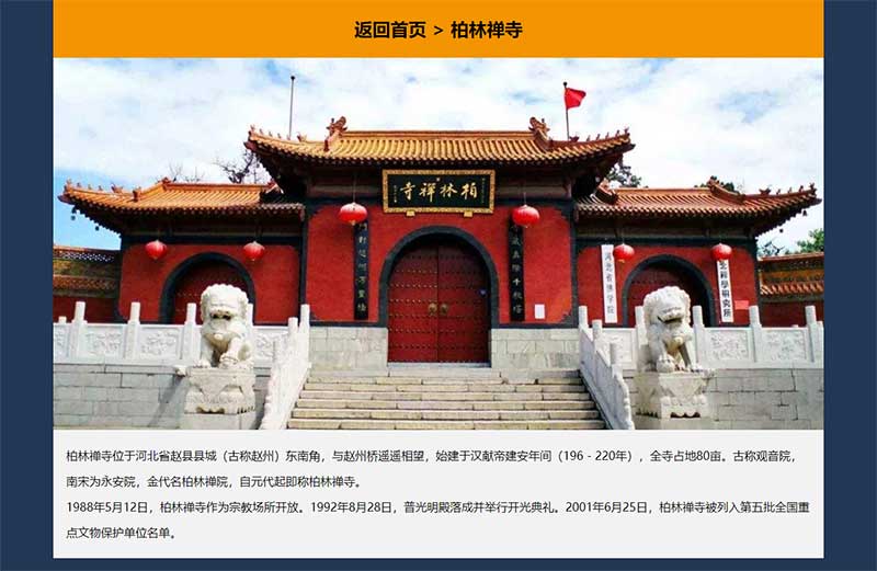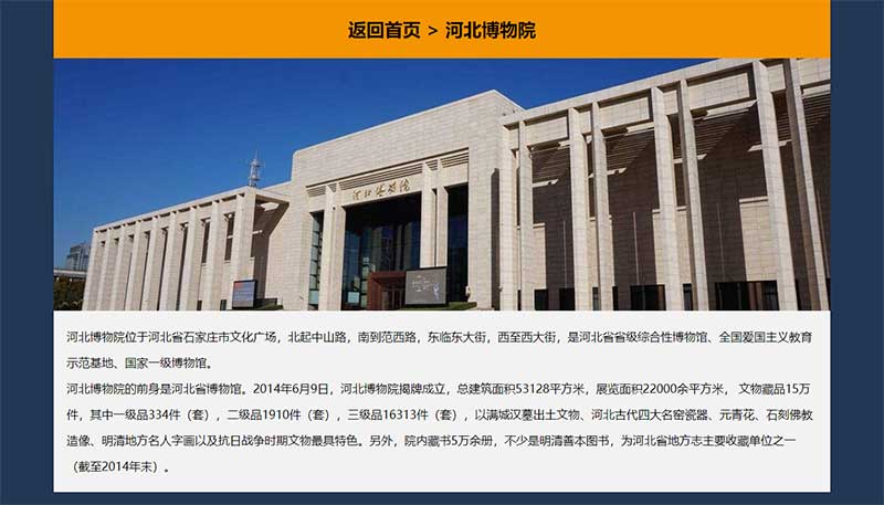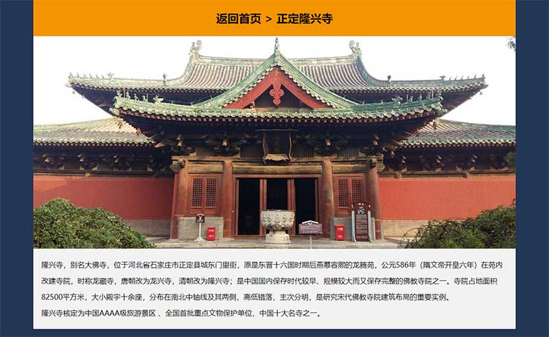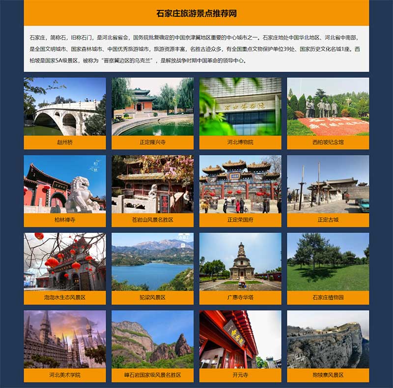 本靜態(tài)網頁設計作品為DIV CSS布局設計,題材為河北省石家莊旅游景點推薦,代碼簡單學生水平,未使用任何JS特效,網頁整體頁面寬度為1200PX,首頁景點列表使用CSS制作了鼠標背景變色效果,景點子頁面均制作了返回首頁的按鈕。