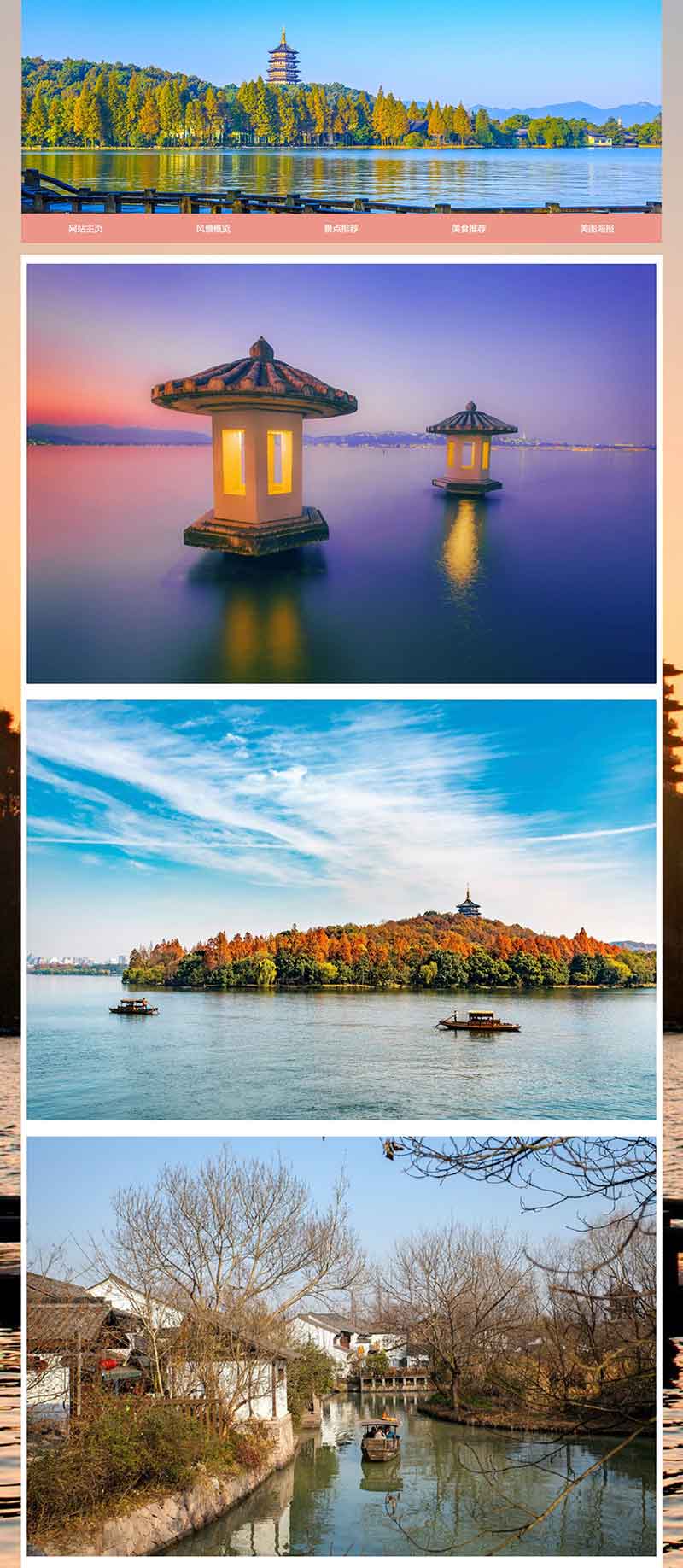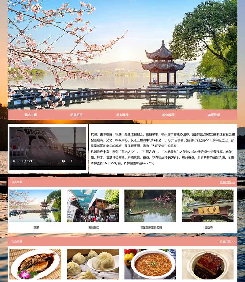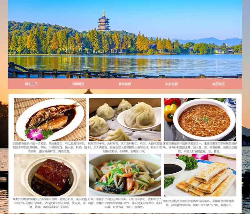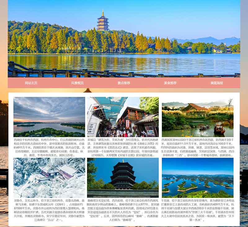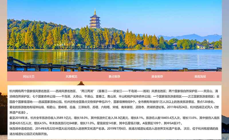 杭州旅游學生靜態網頁設計作品采用TABLE表格布局制作,代碼采用學生基礎水平制作,代碼簡單,排版布局簡單整齊,內容豐富。作品共5頁:網站主頁、風景概覽、景點推薦、美食推薦、美圖海報。