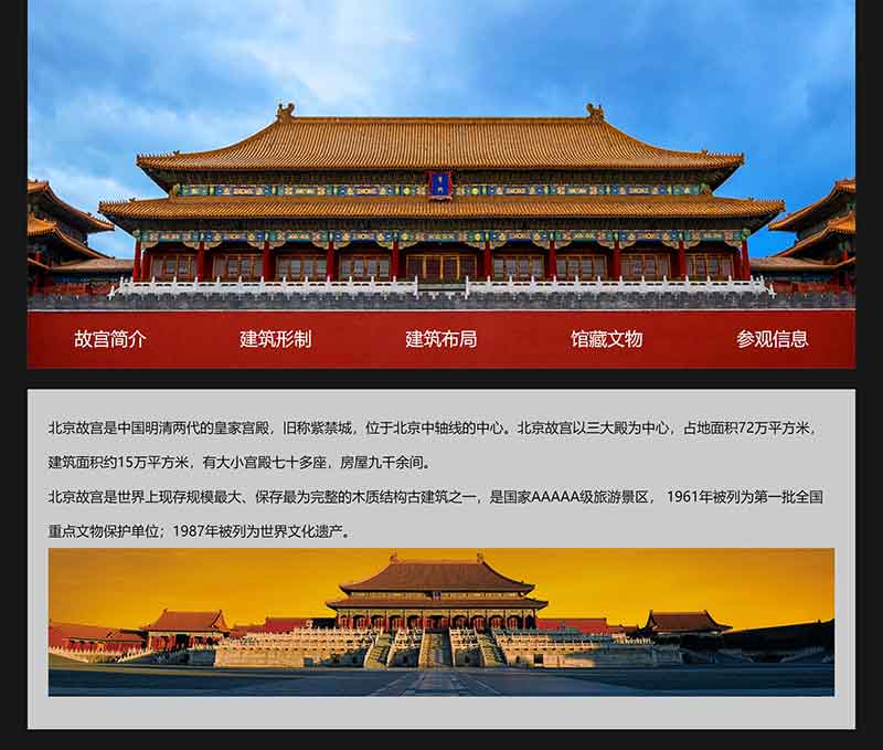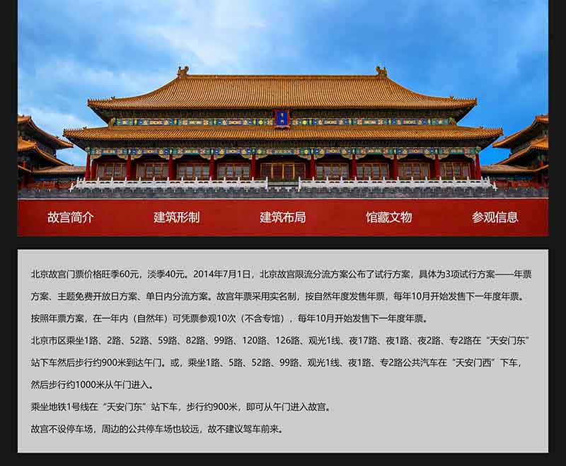 大學(xué)生景點(diǎn)旅游類簡單網(wǎng)頁制作成品以北京故宮為題材,采用DIV CSS布局制作,共5個(gè)頁面,主要內(nèi)容包括故宮簡介、建筑形制、建筑布局、館藏文物、參觀信息方面內(nèi)容。