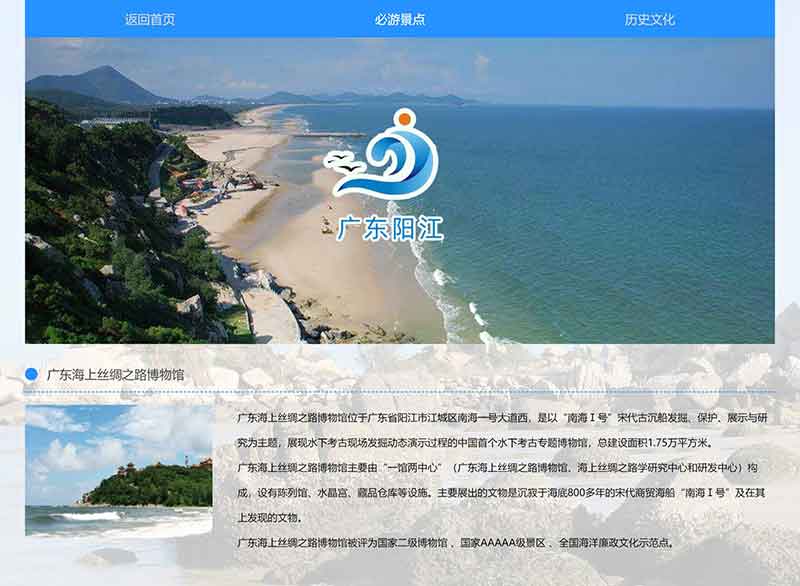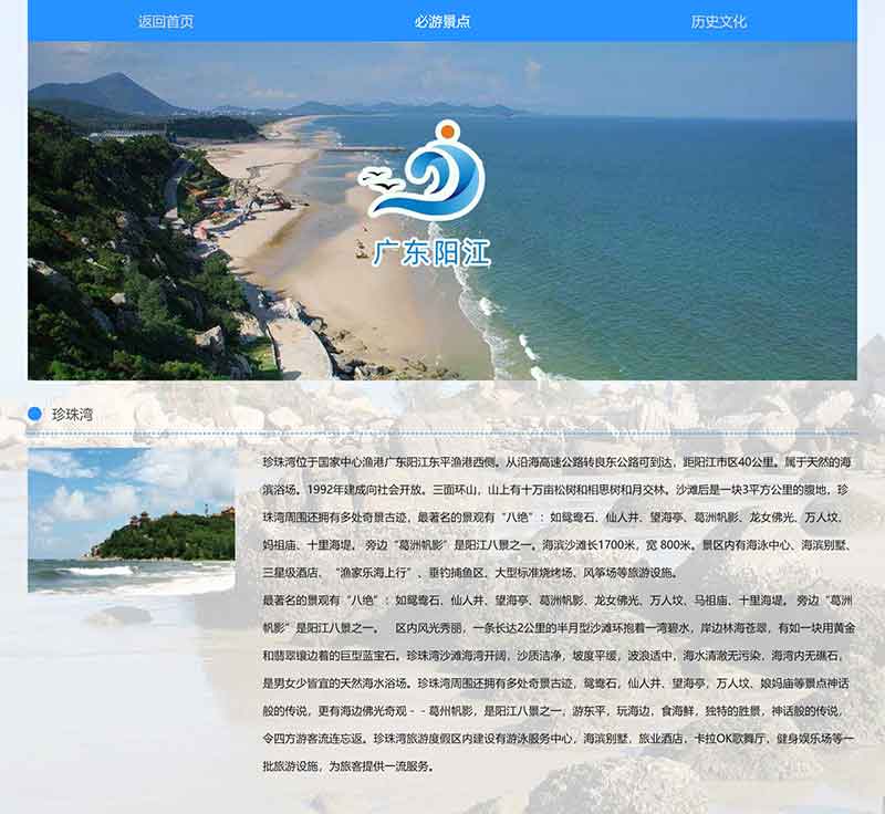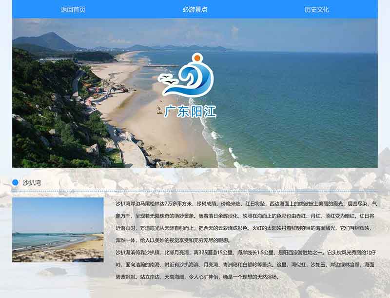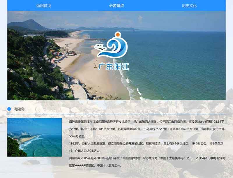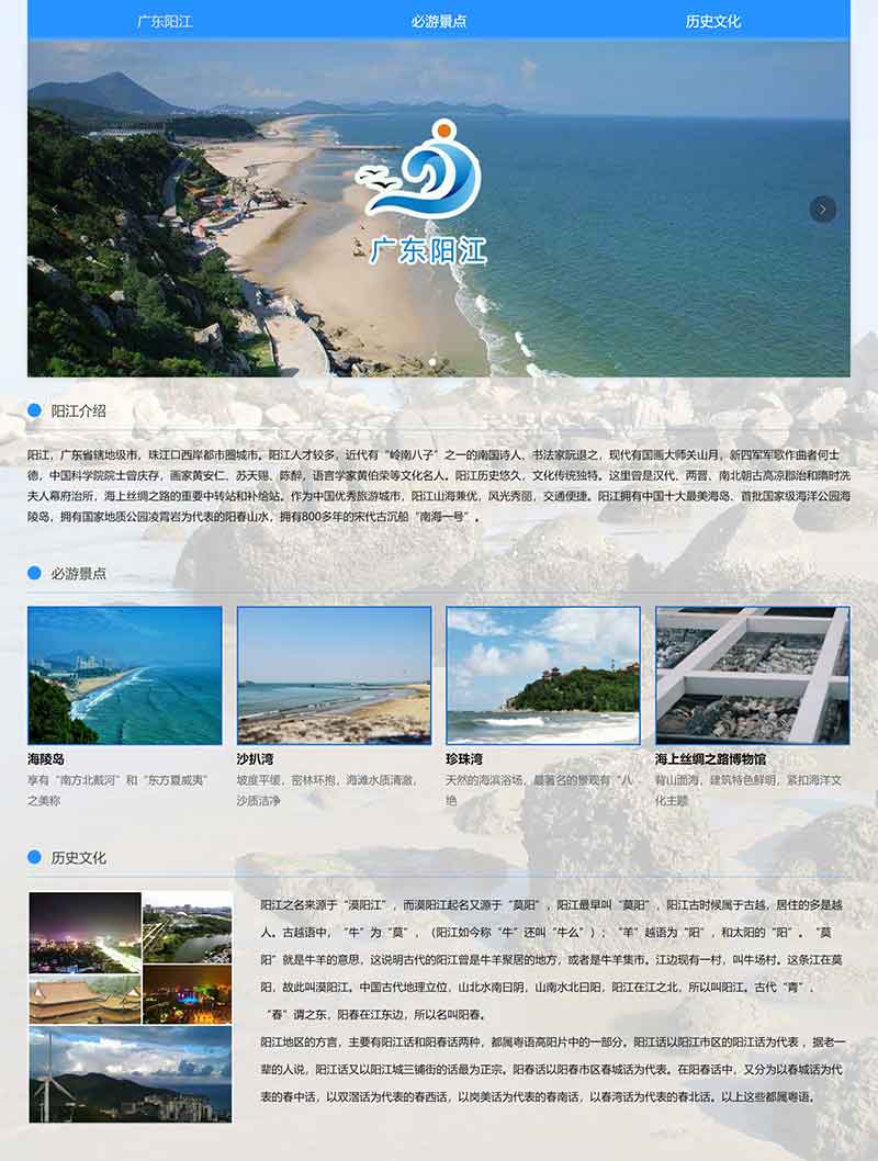 大學生我的家鄉(xiāng)網(wǎng)頁作業(yè)制作題材為廣東省陽江城市介紹,網(wǎng)頁設計作品由DIV CSS布局制作,共5頁,網(wǎng)頁內(nèi)容包括廣東陽江市城市介紹、景點介紹和歷史文化介紹,頁面包含導航欄、大幅圖片,頁面主體部分層次分明,內(nèi)容豐富,緊貼主題。導航部分使用錨點鏈接,首頁景點圖可點擊進入景點詳細介紹頁面。